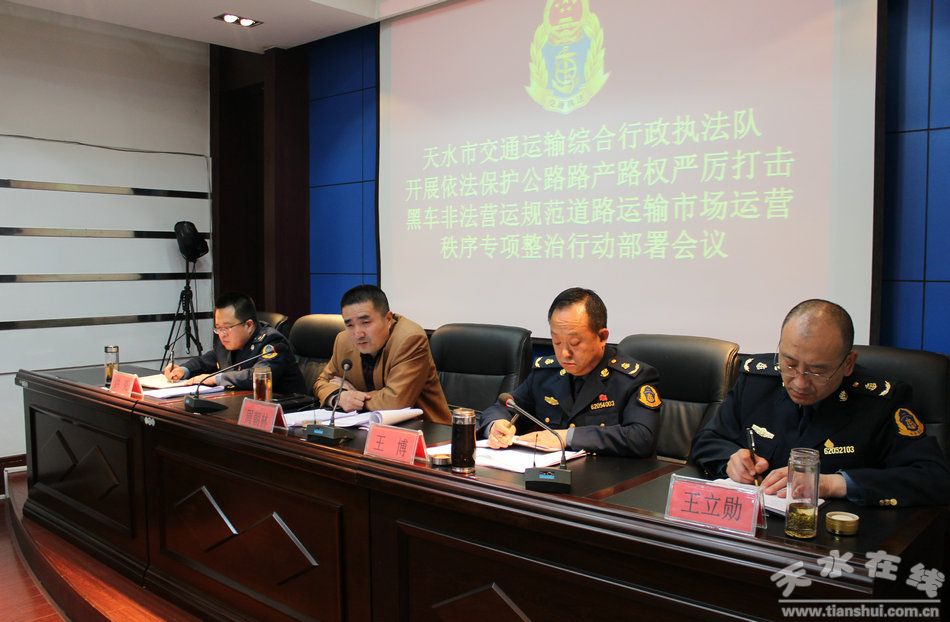 4月8日,天水市交通運(yùn)輸綜合行政執(zhí)法隊(duì)召開(kāi)動(dòng)員大會(huì),安排部署“依法保護(hù)路產(chǎn)路權(quán),嚴(yán)厲打擊黑車(chē)非法營(yíng)運(yùn),規(guī)范道路運(yùn)輸市場(chǎng)運(yùn)營(yíng)秩序”專項(xiàng)整治行動(dòng)各項(xiàng)工作。市交通運(yùn)輸局黨組成員周朝林出席會(huì)議,隊(duì)機(jī)關(guān)全體干部職工、隊(duì)屬各單位負(fù)責(zé)人及一線執(zhí)法隊(duì)員代表參加會(huì)議。