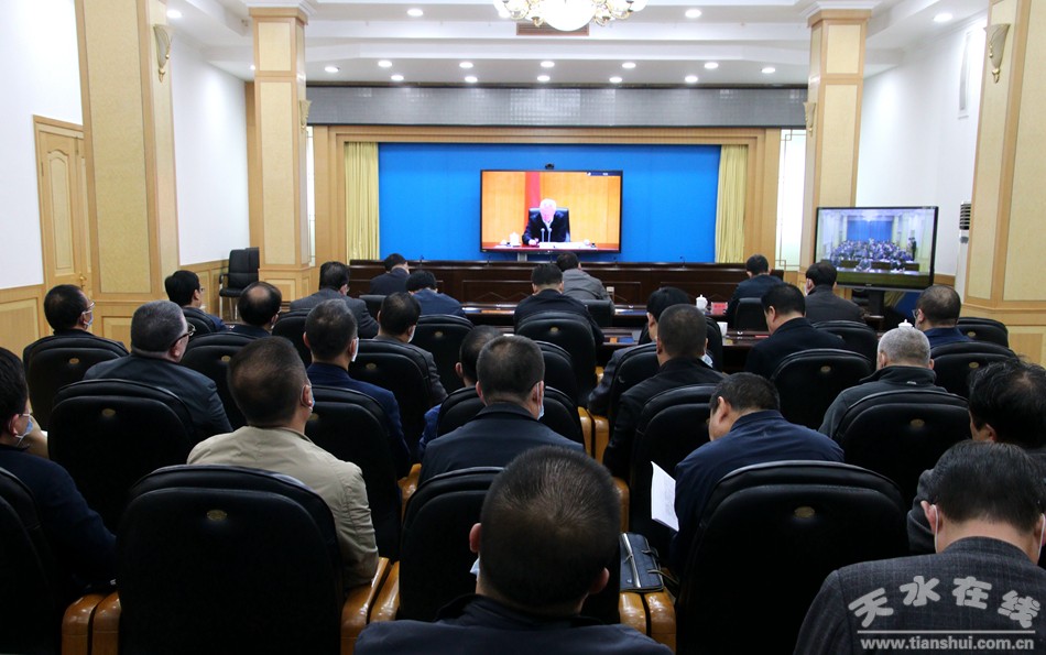 (天水市委副書記、市長王軍,副市長逯克宗、董小平在天水分會場收聽收看會議。) |