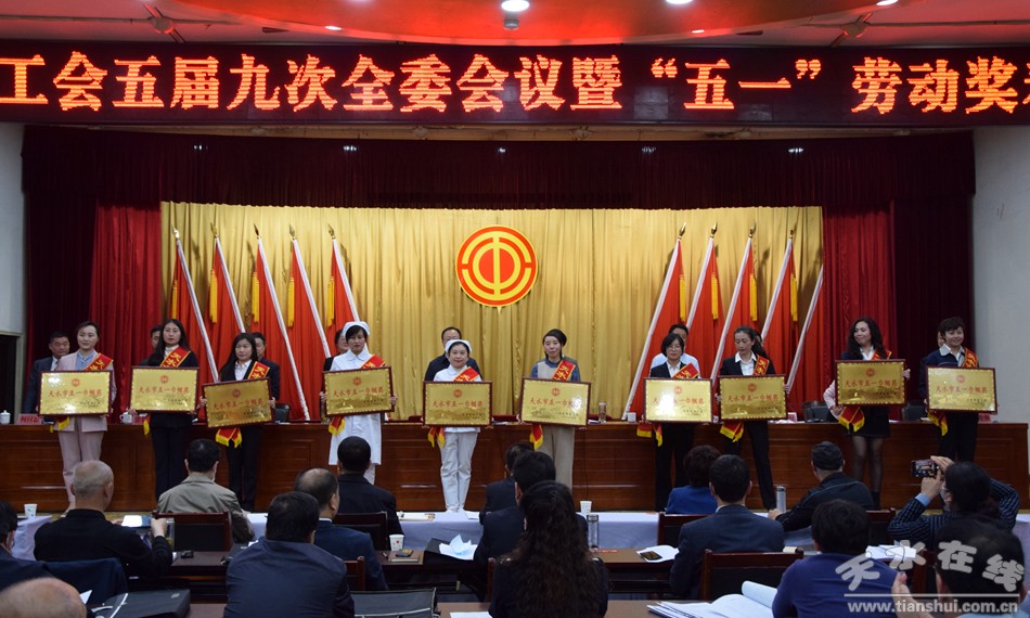 4月28日下午,天水市總工會(huì)五屆九次全委會(huì)議暨“五一”勞動(dòng)獎(jiǎng)表彰大會(huì)在市迎賓館召開,傳達(dá)省總工會(huì)十二屆六次全委會(huì)議精神,總結(jié)2019年工作,部署2020年工作任務(wù),表彰榮獲天水市五一勞動(dòng)獎(jiǎng)狀、獎(jiǎng)?wù)隆⒐と讼蠕h號(hào)和五一巾幗獎(jiǎng)的先進(jìn)集體和先進(jìn)個(gè)人。市委常委、組織部部長(zhǎng)賈義翔,市政協(xié)副主席高媛瑾出席會(huì)議,市人大常委會(huì)副主任、市總工會(huì)主席王曉琴主持會(huì)議。