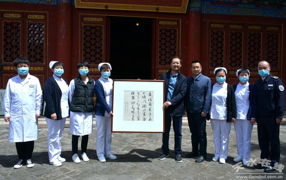 同時(shí),為表達(dá)對市第一人民醫(yī)院馳援武漢醫(yī)護(hù)人員的敬意,天水美術(shù)館書畫家揮毫贈(zèng)英雄,將精心創(chuàng)作的11幅書法、繪畫作品分別捐贈(zèng)給他們,作為致敬英雄的“厚禮”。