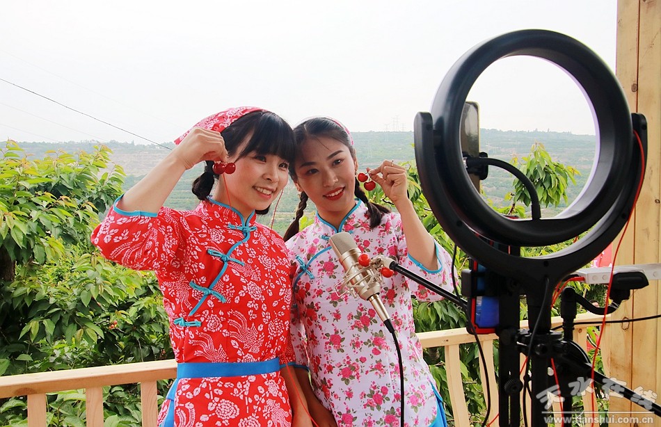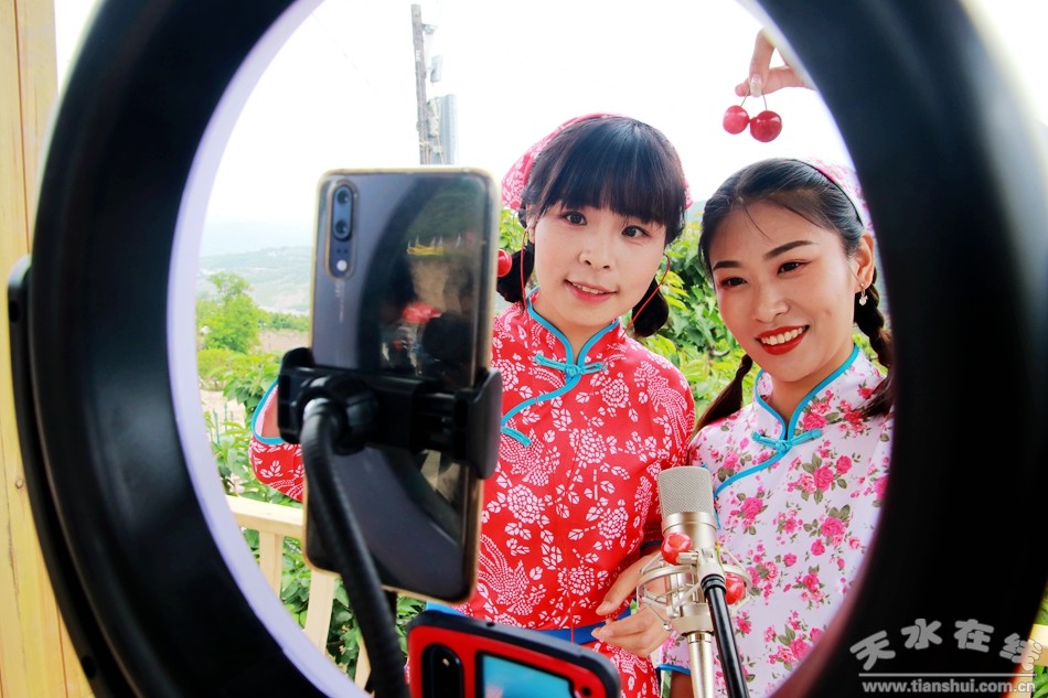 (天水在線主播通過天水電信5G網(wǎng)絡在煙鋪櫻桃園“直播帶貨”)