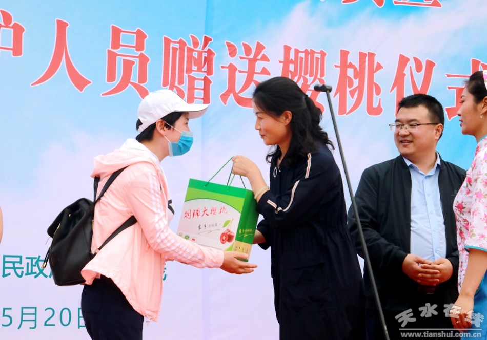 (秦州區(qū)委常委、宣傳部長汪曉娟向天水市馳援武漢醫(yī)護人員代表、天水市中醫(yī)醫(yī)院護士陳明明贈送櫻桃。)