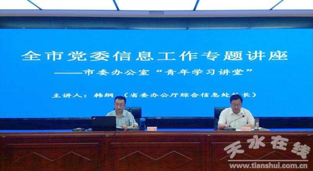 為進(jìn)一步提升黨委辦公部門“三服務(wù)”工作水平,更好發(fā)揮黨委信息工作參謀助手作用,7月16日,天水市委辦公室結(jié)合“青年學(xué)習(xí)講堂”,邀請(qǐng)省委辦公廳綜合信息處處長(zhǎng)韓綱同志為全市黨委辦公部門信息工作人員作了題為《如何做好新時(shí)代黨委信息工作》的專題輔導(dǎo)。市委副秘書長(zhǎng)、辦公室主任張長(zhǎng)平同志主持專題講座。各縣區(qū)委辦公室主任、分管信息工作的副主任、信息工作人員和市直部門辦公室主任、市委辦公室干部等120余人參加了專題講座。