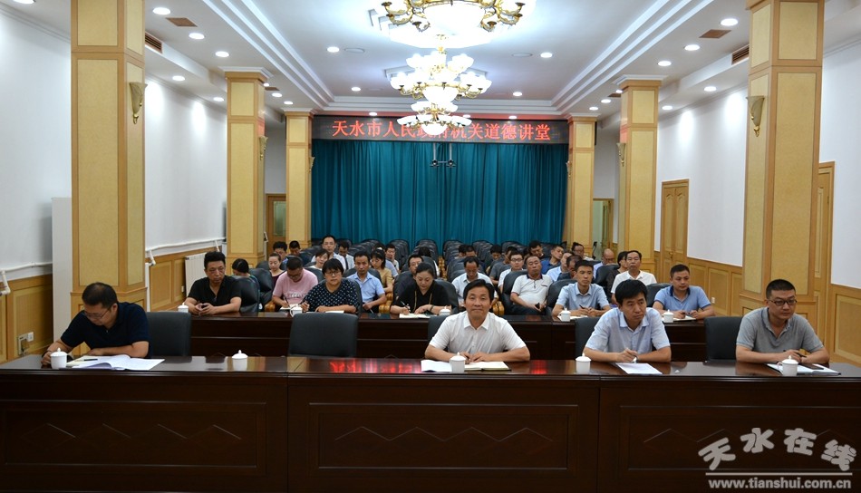 為推進(jìn)學(xué)習(xí)型機(jī)關(guān)建設(shè),加快市政府機(jī)關(guān)全國文明單位創(chuàng)建工作,大力培育和踐行社會主義核心價值觀,充分發(fā)揮先進(jìn)典型的示范引領(lǐng)作用,8月7日下午,市政府機(jī)關(guān)舉辦道德講堂,邀請2017年度“天水好人”、天水市第七屆道德模范、天水市“十佳”班主任、市逸夫中學(xué)教師石瑞為市政府機(jī)關(guān)干部職工作題為《平凡之路—我的粉筆生涯碎影》的專題報告。