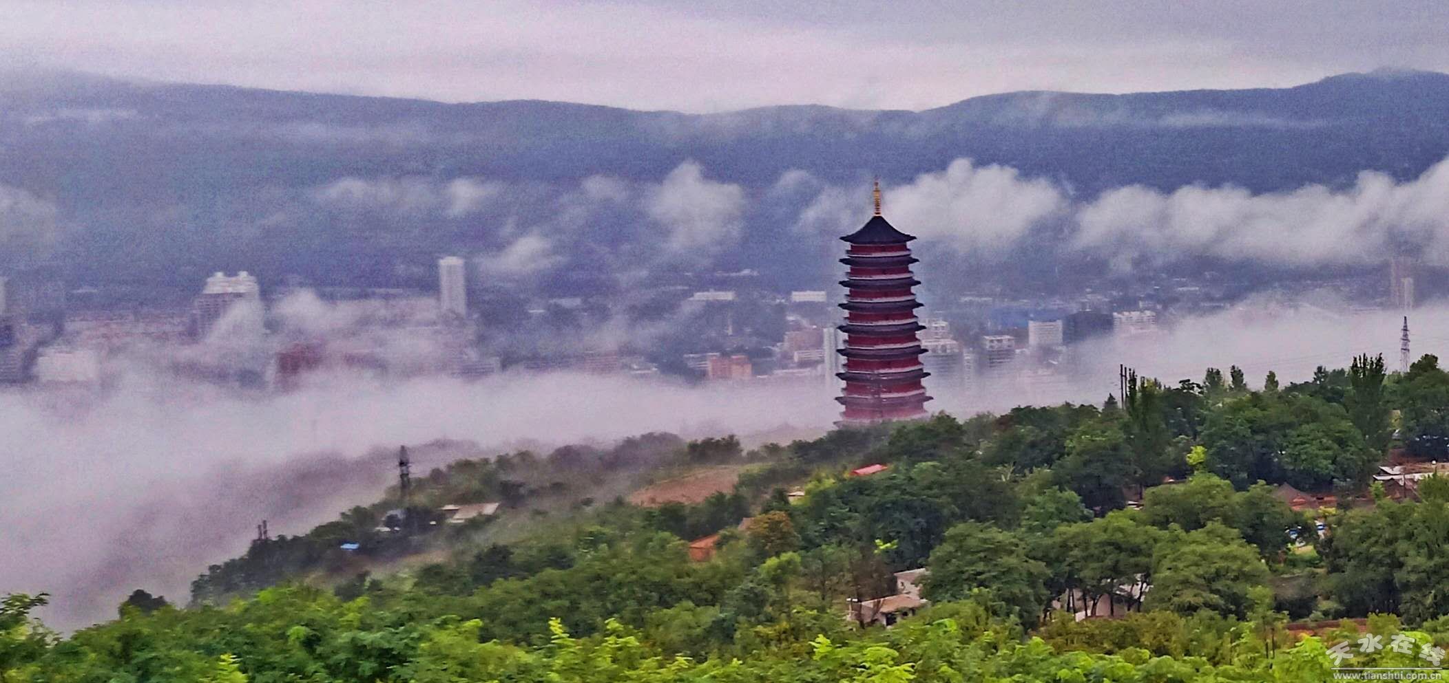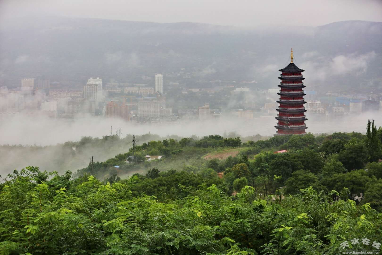 自8月14日上午開始,天水市出現(xiàn)大范圍降水天氣,截止16日07時(shí),全市普降大到暴雨。16日上午7時(shí)左右,大雨中的天水,云霧彌漫,宛若仙境。(楊彥東8月16日上午7時(shí)攝于南郭寺大景區(qū))