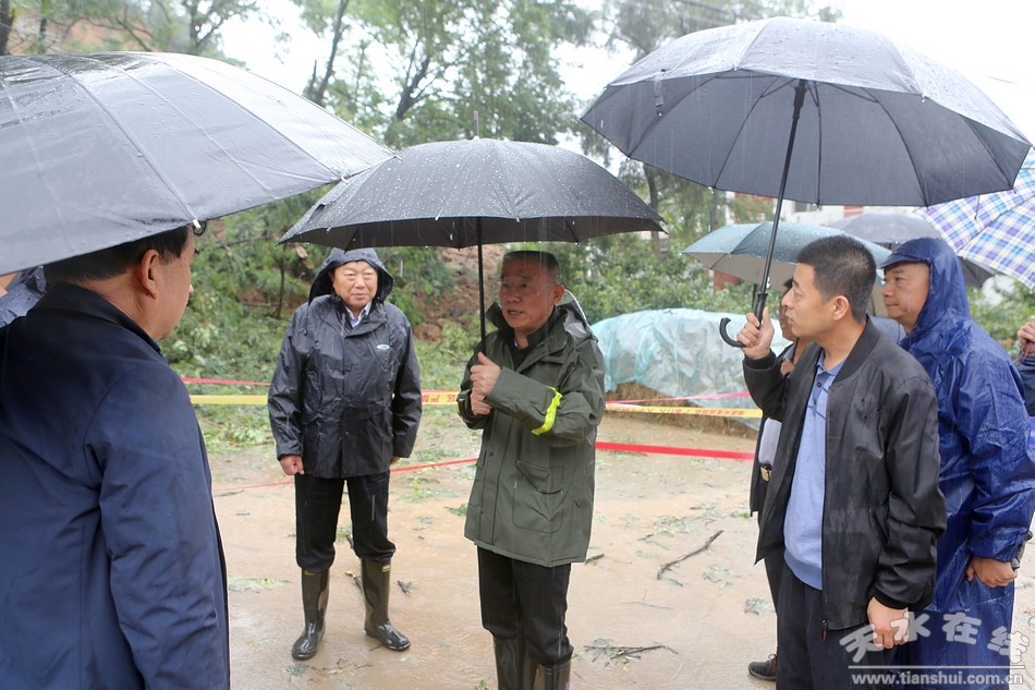 (在秦州區(qū)太京鎮(zhèn)二十鋪村現(xiàn)場察看山體滑坡和農(nóng)戶房屋受災(zāi)情況)