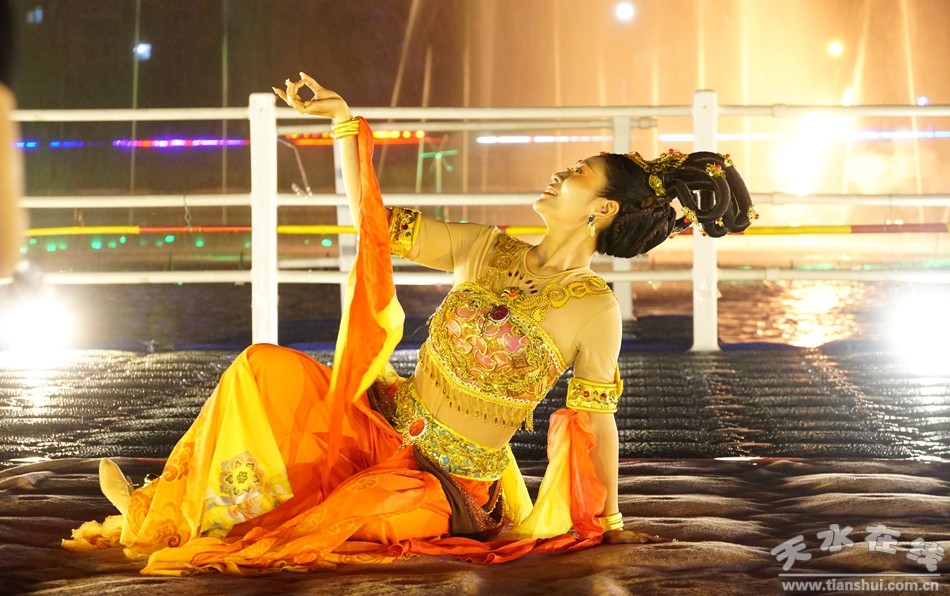 “麥積飛天”舞蹈,由天水在線邀請(qǐng)?zhí)焖懈栉鑸F(tuán)王時(shí)飛導(dǎo)演根據(jù)麥積山石窟散花樓飛天壁畫和天女散花故事創(chuàng)編,由天水在線主播萌萌主演,天水藝術(shù)學(xué)校學(xué)生伴舞,每周五周六晚上,在天水湖“大美天水”音樂噴泉舞臺(tái)進(jìn)行表演。