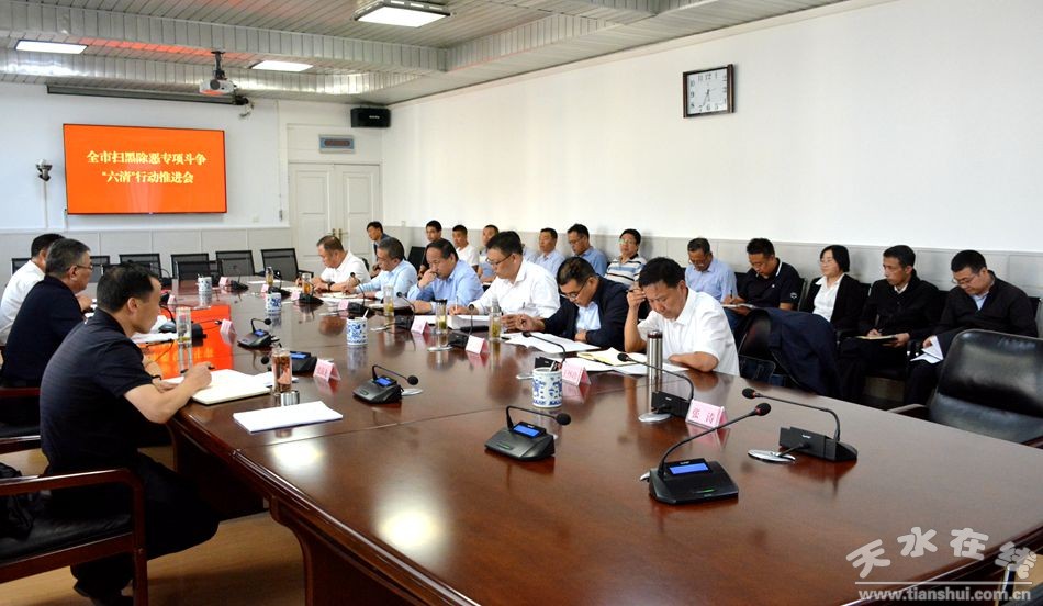 9月11日,天水市委常委、政法委書記、市掃黑除惡專項斗爭領(lǐng)導(dǎo)小組常務(wù)副組長蒲軍主持召開全市掃黑除惡專項斗爭“六清”行動推進(jìn)會,通報了“六清”行動開展情況和各縣區(qū)重點工作中存在的問題。他強調(diào),各縣區(qū)要進(jìn)一步提高政治站位,正視問題,找準(zhǔn)短板,靠實責(zé)任,全面提升“六清”行動的質(zhì)量和效果,確!傲濉比蝿(wù)按期完成。