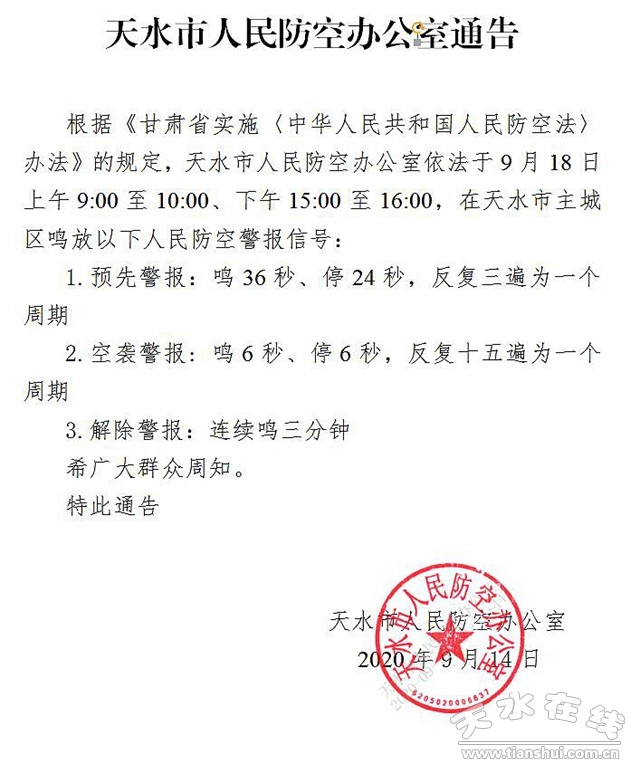 天水市人民防空辦公室通告