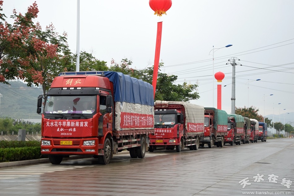 在天水花牛蘋果產(chǎn)業(yè)園里,一顆顆經(jīng)過分揀、分級、包裝的蘋果,裝運到一輛輛配備冷藏設(shè)施的大貨車上,當天,由天水花牛蘋果集團將收購的8車78噸花牛蘋果鮮果,發(fā)往北京、上海、武漢、東莞、嘉興、昆明等地。