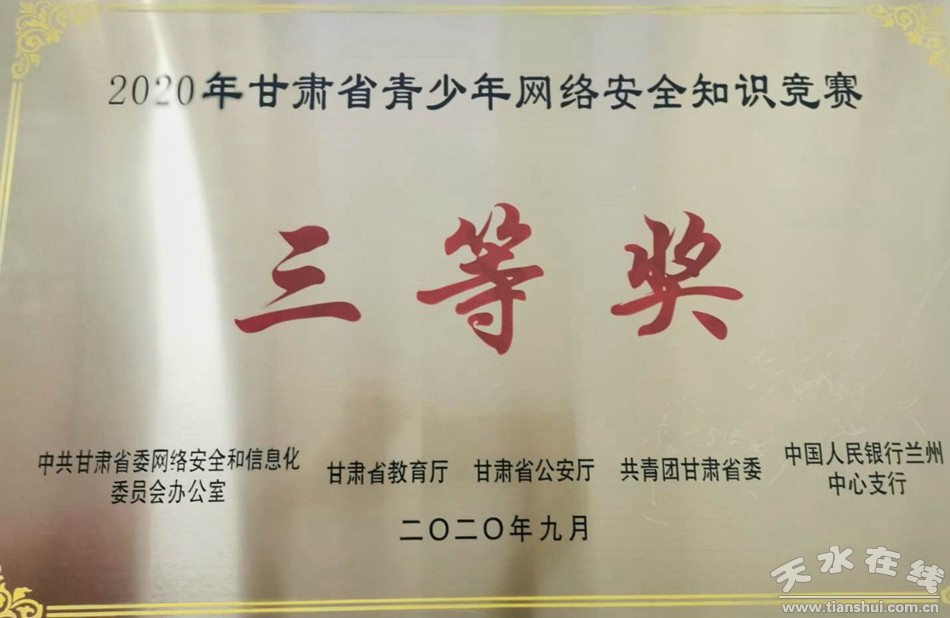 9月20日,在甘肅省青少年網(wǎng)絡(luò)安全知識(shí)競(jìng)賽總決賽中,我市代表隊(duì)榮獲三等獎(jiǎng)。