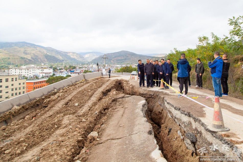 8月以來,受強(qiáng)降雨天氣影響,秦州區(qū)關(guān)子鎮(zhèn)柳下溝門村發(fā)生山體滑坡,造成剛建成的國道310升級(jí)改造工程關(guān)子鎮(zhèn)段部分路基沉降,路面開裂。當(dāng)日,趙四輩一行對(duì)國道310線關(guān)子段滑坡情況進(jìn)行了現(xiàn)場檢查,并對(duì)發(fā)現(xiàn)存在的安全隱患應(yīng)急處置工作進(jìn)行了安排部署。