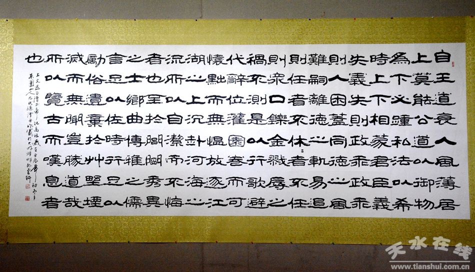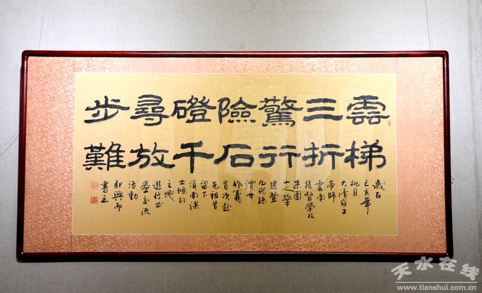 副市長(zhǎng)汪小娟作了講話,她贊揚(yáng)了鞏作義先生情系家鄉(xiāng)、無(wú)私奉獻(xiàn)的精神,并對(duì)此次展覽給予了充分肯定,希望我市文藝工作者多交流、多切磋、多研討,進(jìn)一步提高文藝創(chuàng)作水平,努力把我市書法藝術(shù)推向一個(gè)新境界,推進(jìn)天水文化藝術(shù)的繁榮與發(fā)展。最后鞏作義先生作了致辭,市委常委、宣傳部部長(zhǎng)張建杰宣布展覽開(kāi)幕。