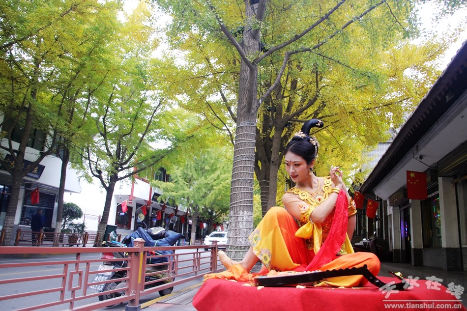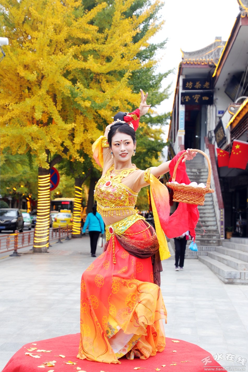 天水在線10月26日報(bào)道 隨著天水市秦州區(qū)青年北路的銀杏樹葉漸漸變黃,黃葉開始飛舞,青年北路又再次變身為“黃金大道”。當(dāng)日,天水在線主播萌萌變身“麥積飛天”率先開啟2020年天水“黃金大道”打卡模式。