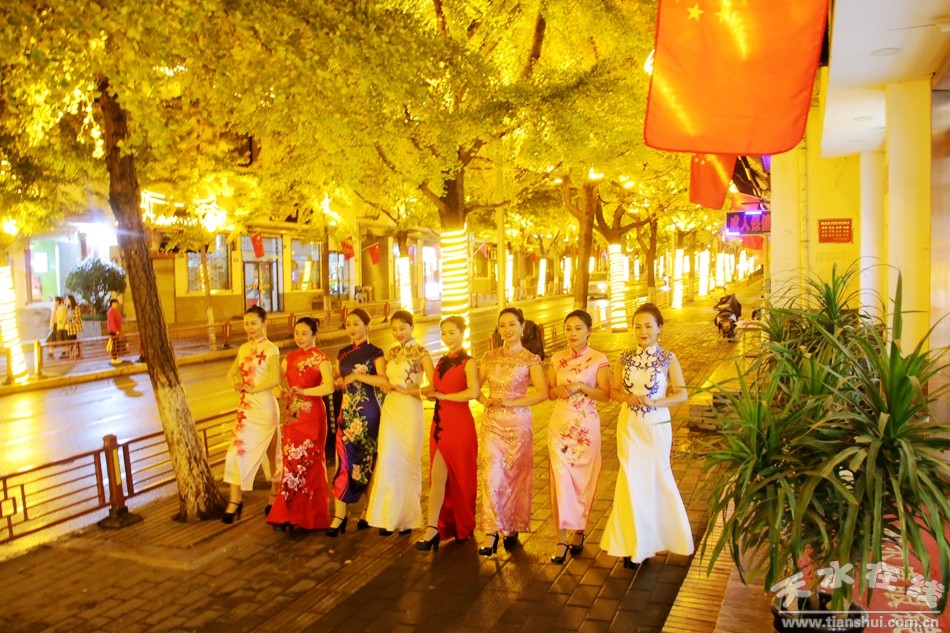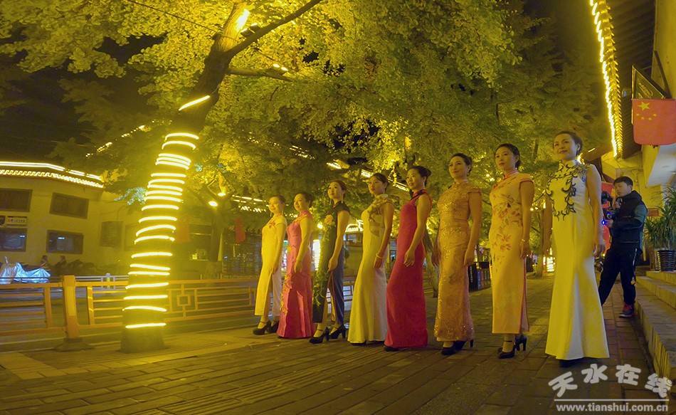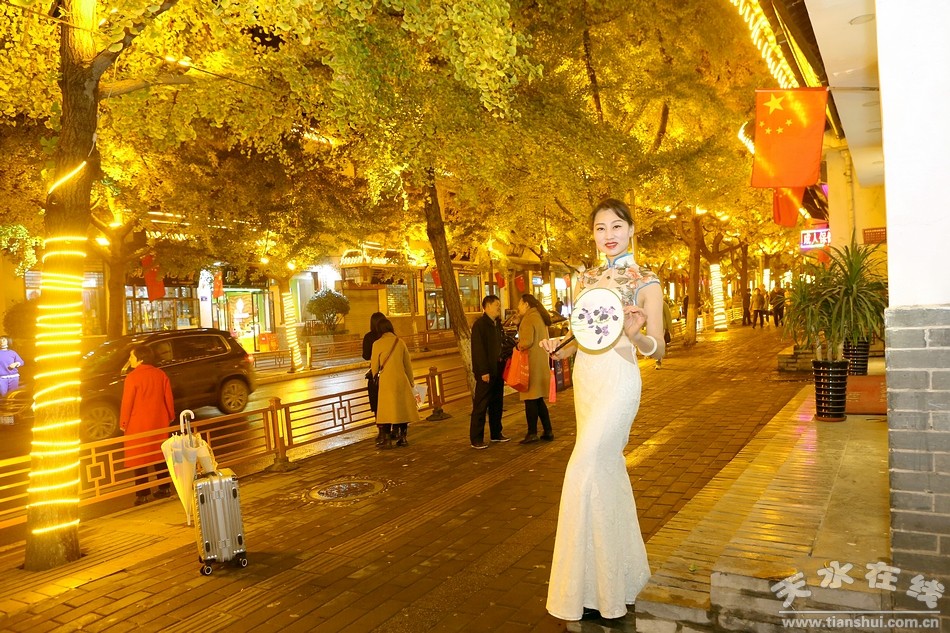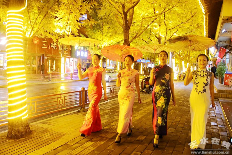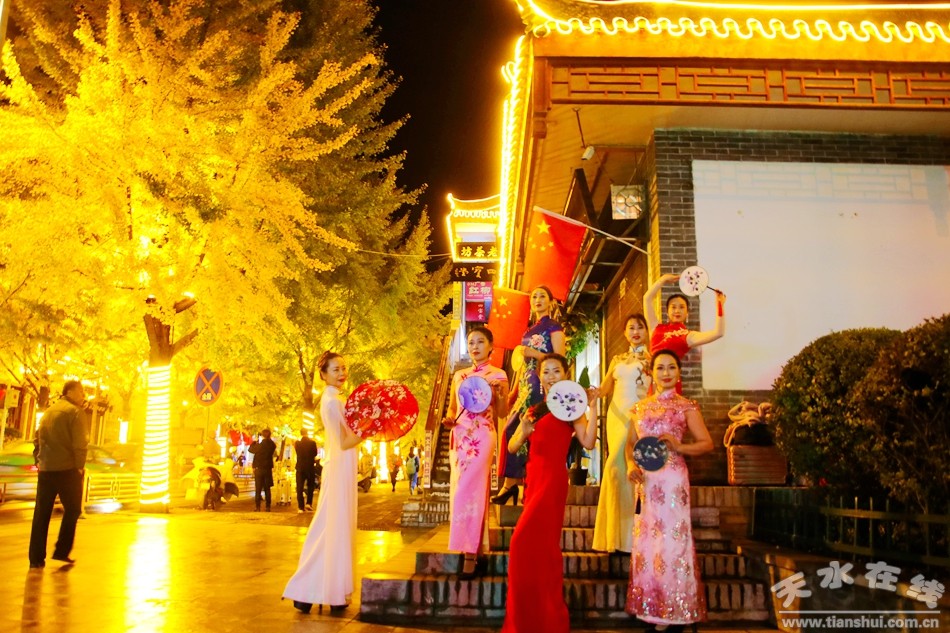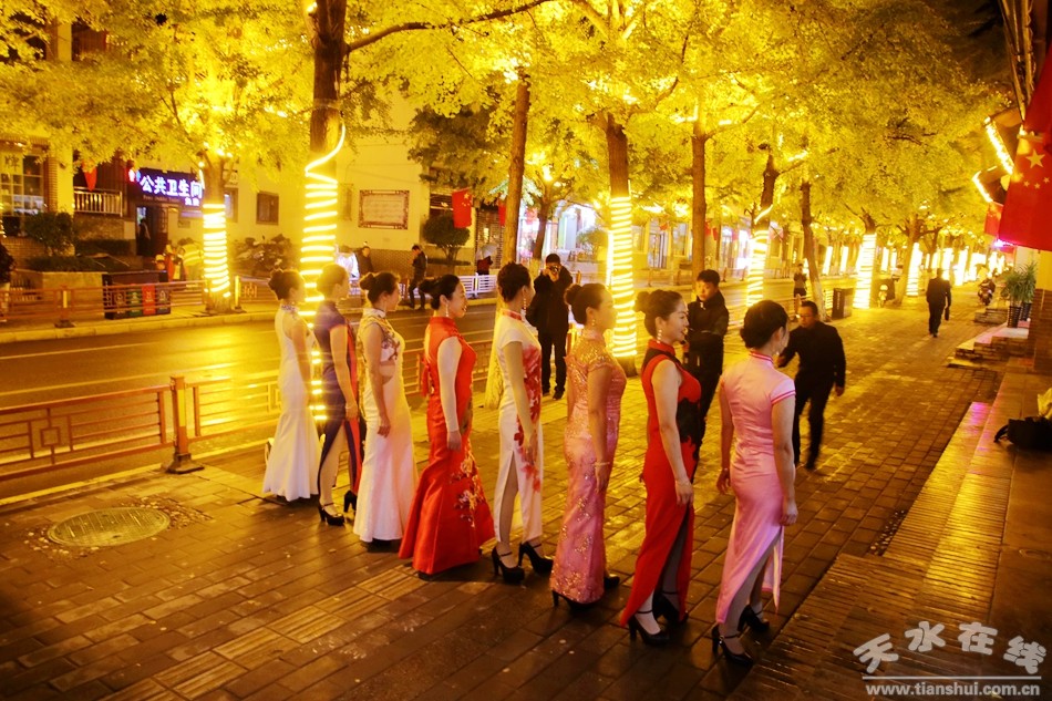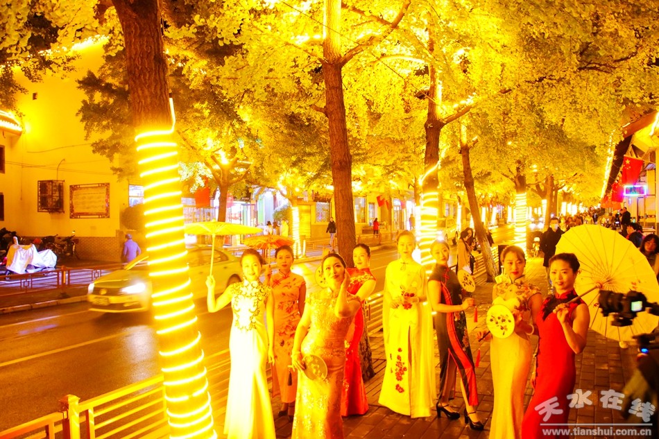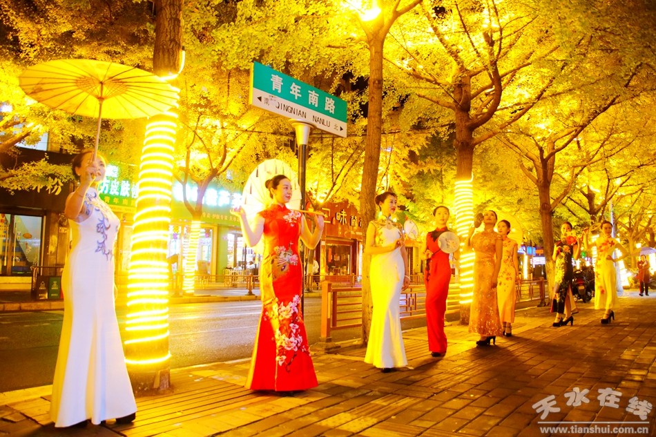 (旗袍麗人打卡“黃金大道” 天水在線攝于10月27日晚) |