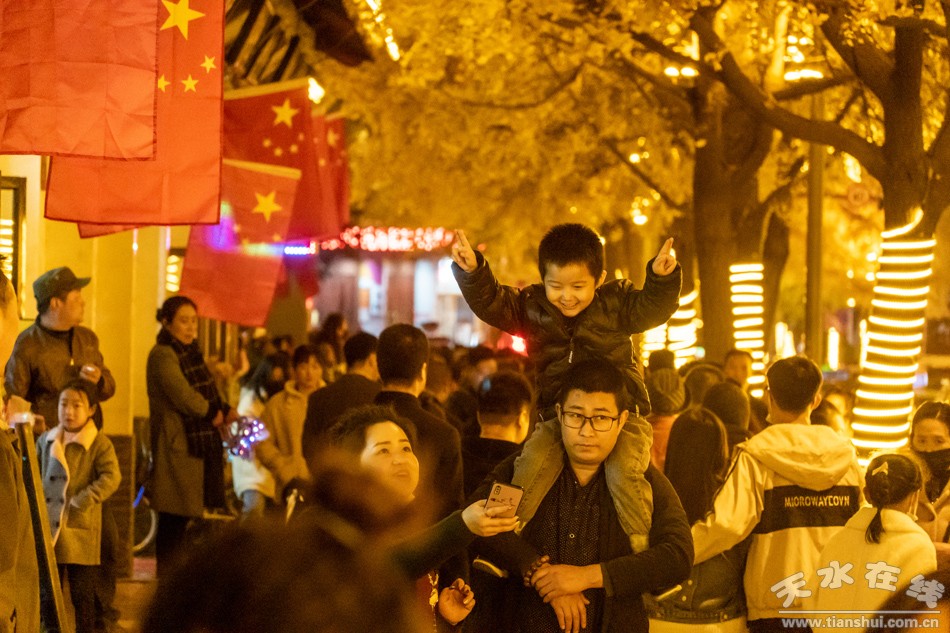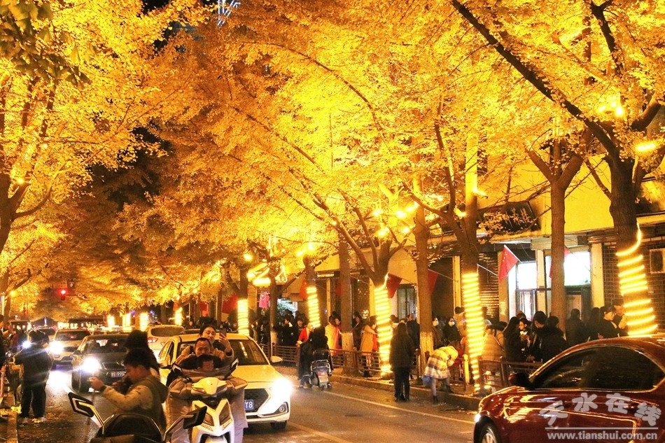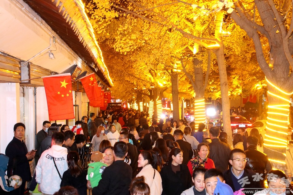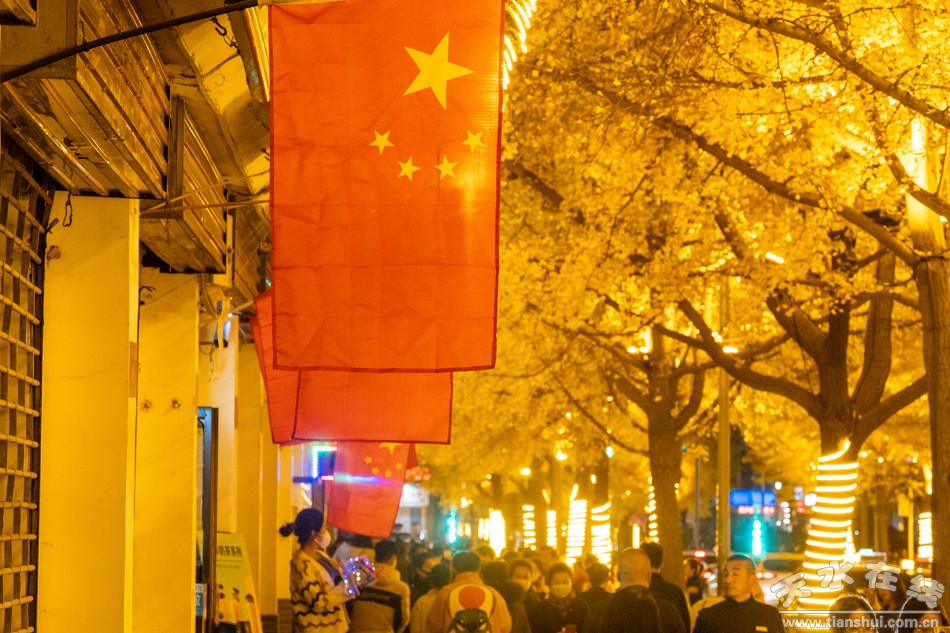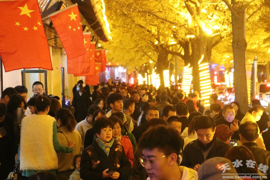 11月6日晚,路兩邊的建筑在燈光的映襯下顯得金碧輝煌,銀杏樹上金黃色的銀杏葉在燈光的映照下閃閃發(fā)光,人行道上滿地的落葉一片金黃,銀杏樹上金黃色的燈帶讓整條街顯得非常溫馨,滿街迎風飄揚的五星紅旗格外美麗,天水“黃金大道”迎來一年當中最美的時光,從四面八方趕來欣賞深秋生態(tài)美景、向往美好生活的游人,絡(luò)繹不絕,好似過年一樣。