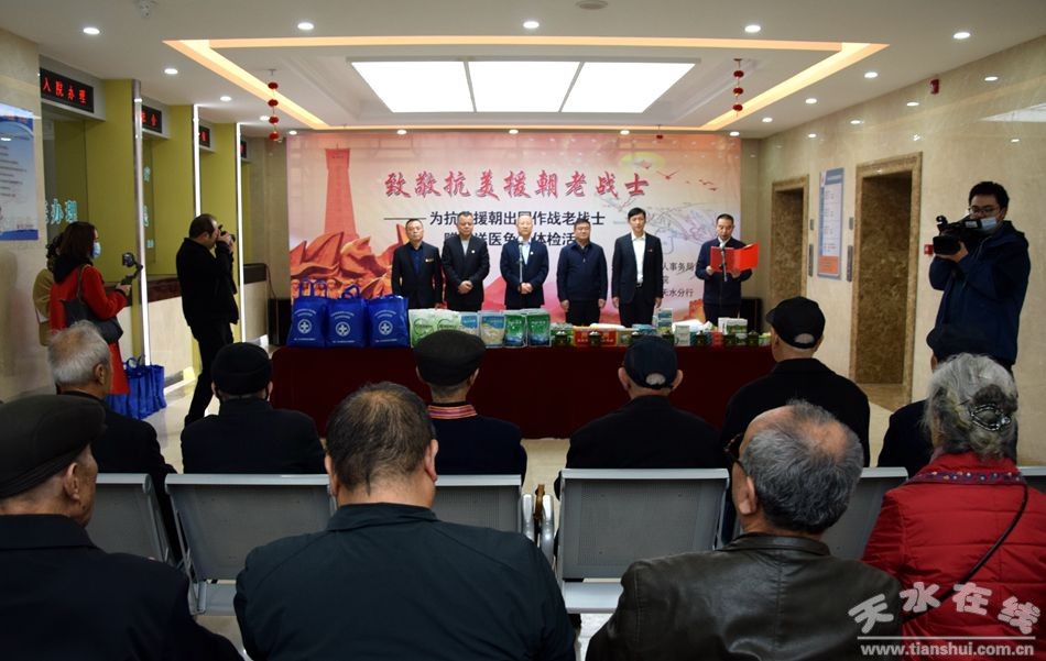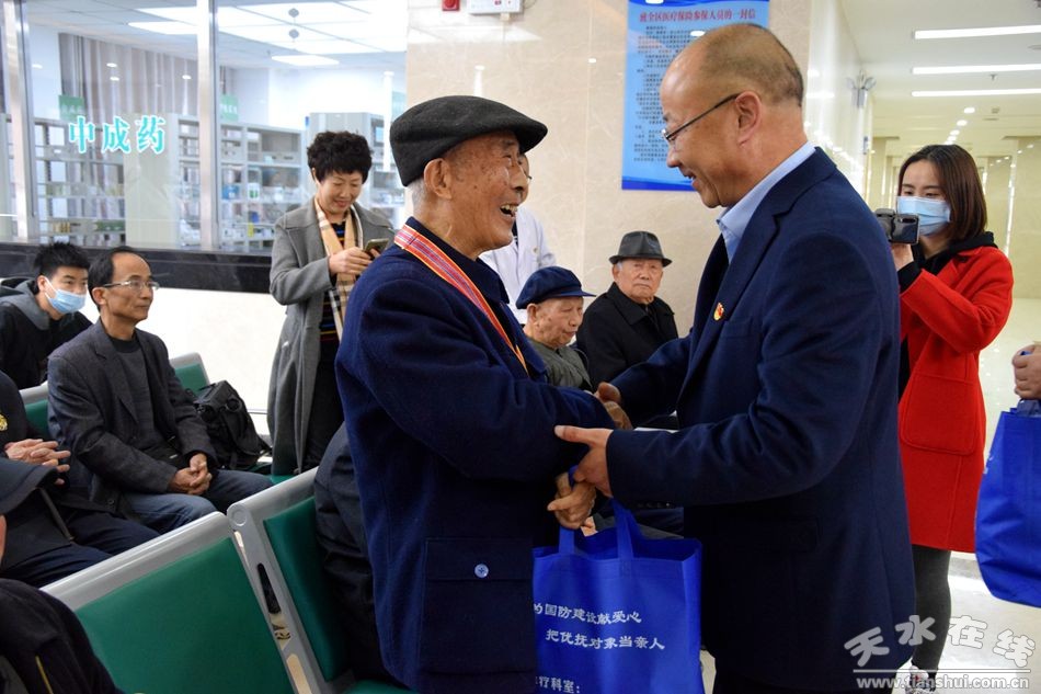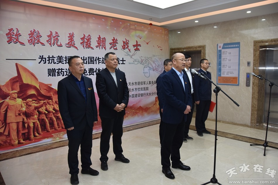 為認(rèn)真貫徹落實(shí)習(xí)近平總書記在紀(jì)念中國(guó)人民志愿軍抗美援朝出國(guó)作戰(zhàn)70周年大會(huì)上重要講話精神,有效提升我市優(yōu)撫事業(yè)發(fā)展,11月11日,由天水市退役軍人事務(wù)局主辦,天水市優(yōu)撫醫(yī)院承辦,中國(guó)建設(shè)銀行天水分行協(xié)辦的“致敬抗美援朝老戰(zhàn)士”活動(dòng)在天水市優(yōu)撫醫(yī)院舉行,開展為抗美援朝老戰(zhàn)士提供贈(zèng)藥送醫(yī)免費(fèi)體檢服務(wù)活動(dòng)。