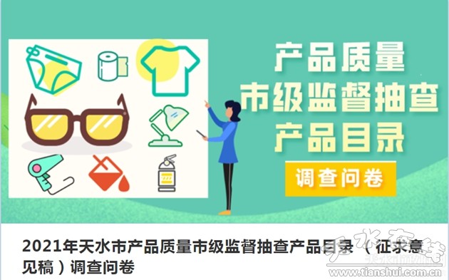 為做好產(chǎn)品質(zhì)量市級(jí)監(jiān)督抽查工作,進(jìn)一步提高產(chǎn)品質(zhì)量監(jiān)督抽查工作的科學(xué)性、有效性和針對(duì)性,近日,天水市市場(chǎng)監(jiān)督管理局印發(fā)《關(guān)于公開征集 2021年產(chǎn)品質(zhì)量市級(jí)監(jiān)督抽查產(chǎn)品目錄的通告》,采取調(diào)查問卷方式,廣泛征集全市各行業(yè)及全體市民對(duì)2021年產(chǎn)品質(zhì)量市級(jí)監(jiān)督抽查產(chǎn)品目錄的意見建議。