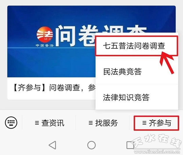 2、點擊下方“齊參與”菜單找到“七五”普法問卷調(diào)查;