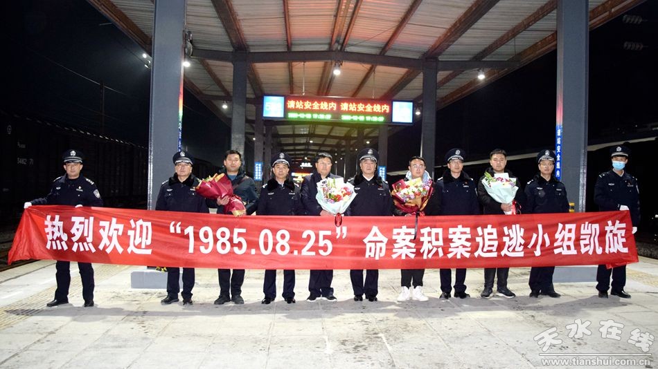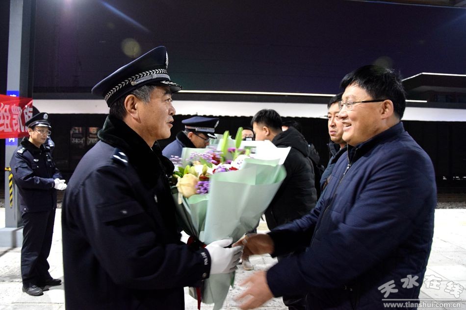 12月8日19時(shí)許,天水市武山警方偵破35年前“蔚某故意殺人案”專案組押解犯罪嫌疑人凱旋。市、縣兩級(jí)公安機(jī)關(guān)負(fù)責(zé)人到天水火車站迎接專案組,對(duì)武山縣公安局取得的重大戰(zhàn)果表示祝賀,向參與偵查、抓捕、押解工作的民警進(jìn)行慰問(wèn)。