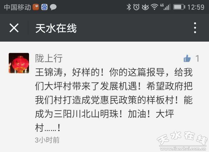 雞年新春大吉大利,雞年日子紅紅火火。就在今年春節(jié)期間,天水市麥積區(qū)石佛鎮(zhèn)大坪村因為《大坪村,變化大》 登上了人民日報頭版頭條,讓天水人民感到十分自豪。大坪村,這個普通的小村落無疑也成了天水人春節(jié)假期中最為關注的網絡熱點。文章的作者,人民日報記者王錦濤,也是土生土長的大坪村娃娃。聽說王錦濤還在村上,天水在線第一時間走進大坪村,對這位天水的“山里娃”進行專訪。