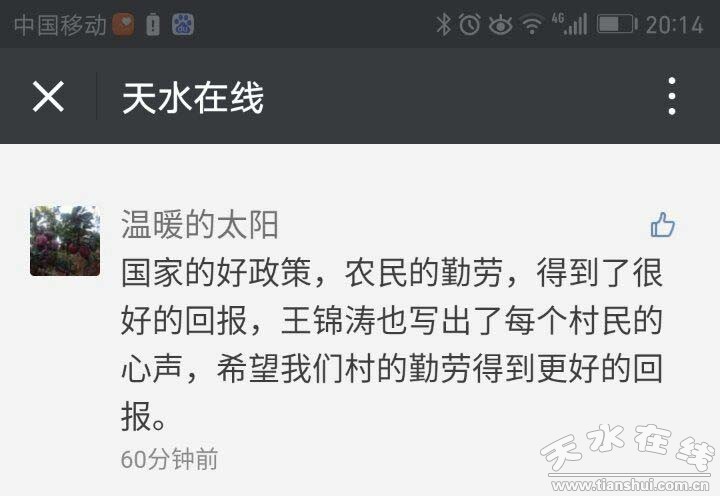 王錦濤是一個普普通通的天水山里娃,依靠自身努力走出大山來到首都北京,成為了一名人民日報的記者。春節(jié)回家期間,他用筆墨記錄近年來家鄉(xiāng)的變化,書寫自己的切身體會!洞笃捍 變化大》登上了人民日報頭版頭條,讓全國人民知道了這個天水普通村落的發(fā)展變化。