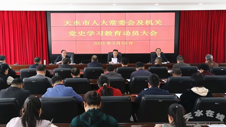 3月16日,天水市人大常委會(huì)及機(jī)關(guān)黨史學(xué)習(xí)教育動(dòng)員大會(huì)召開,對(duì)開展黨史學(xué)習(xí)教育進(jìn)行動(dòng)員部署。市人大常委會(huì)黨組書記、主任蔣曉強(qiáng)出席會(huì)議并講話,他強(qiáng)調(diào),要深入學(xué)習(xí)貫徹習(xí)近平總書記在黨史學(xué)習(xí)教育動(dòng)員大會(huì)上的重要講話精神,認(rèn)真貫徹落實(shí)中央和省、市委關(guān)于黨史學(xué)習(xí)教育的部署要求,學(xué)好百年黨史、傳承紅色基因、凝聚奮進(jìn)力量,以更加昂揚(yáng)的精神狀態(tài)和奮斗姿態(tài)投身到地方人大依法履職、擔(dān)當(dāng)作為的實(shí)踐中,為推動(dòng)全市經(jīng)濟(jì)社會(huì)高質(zhì)量發(fā)展和民主法治建設(shè)作出新的貢獻(xiàn)。