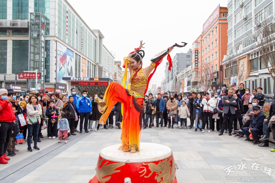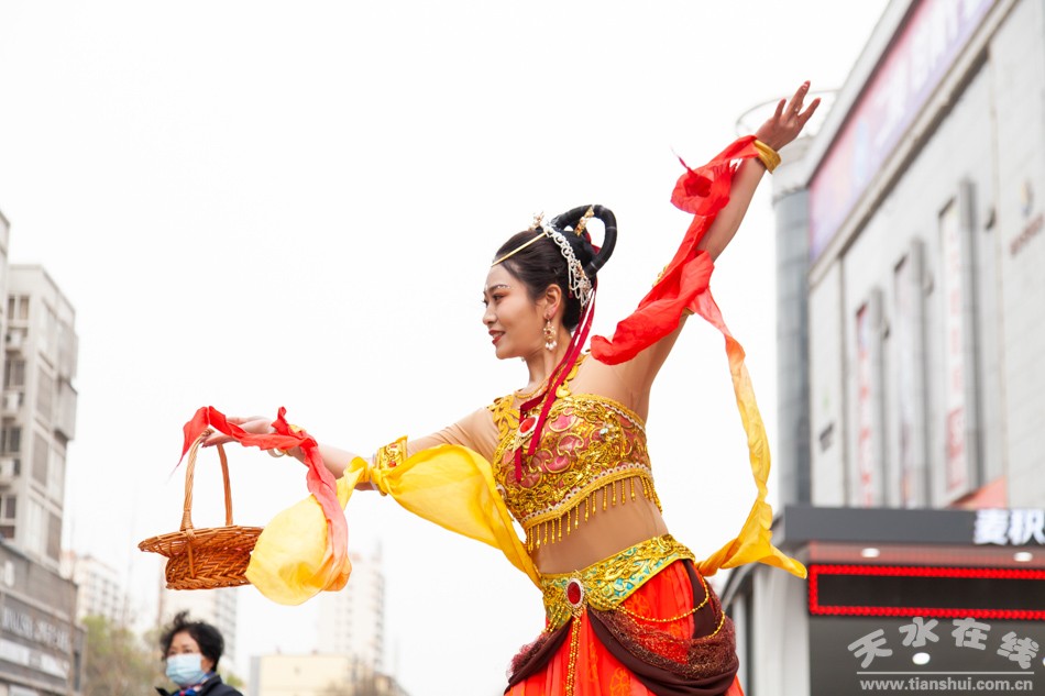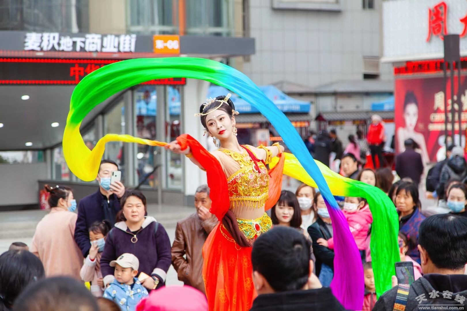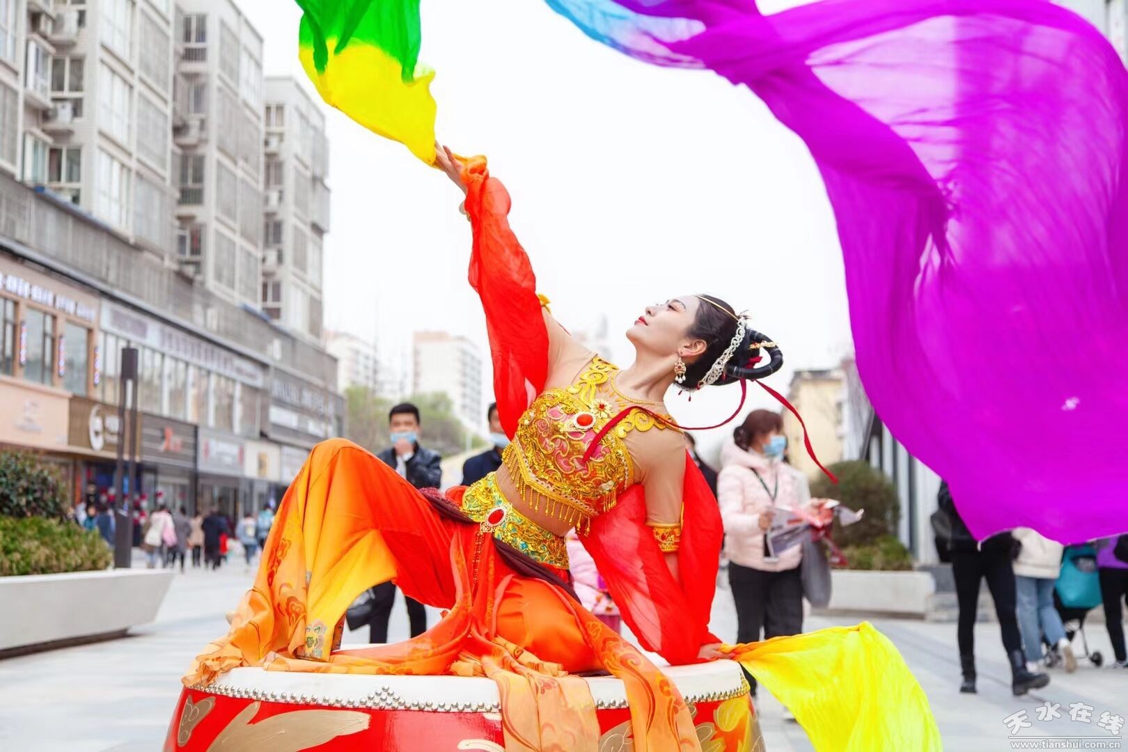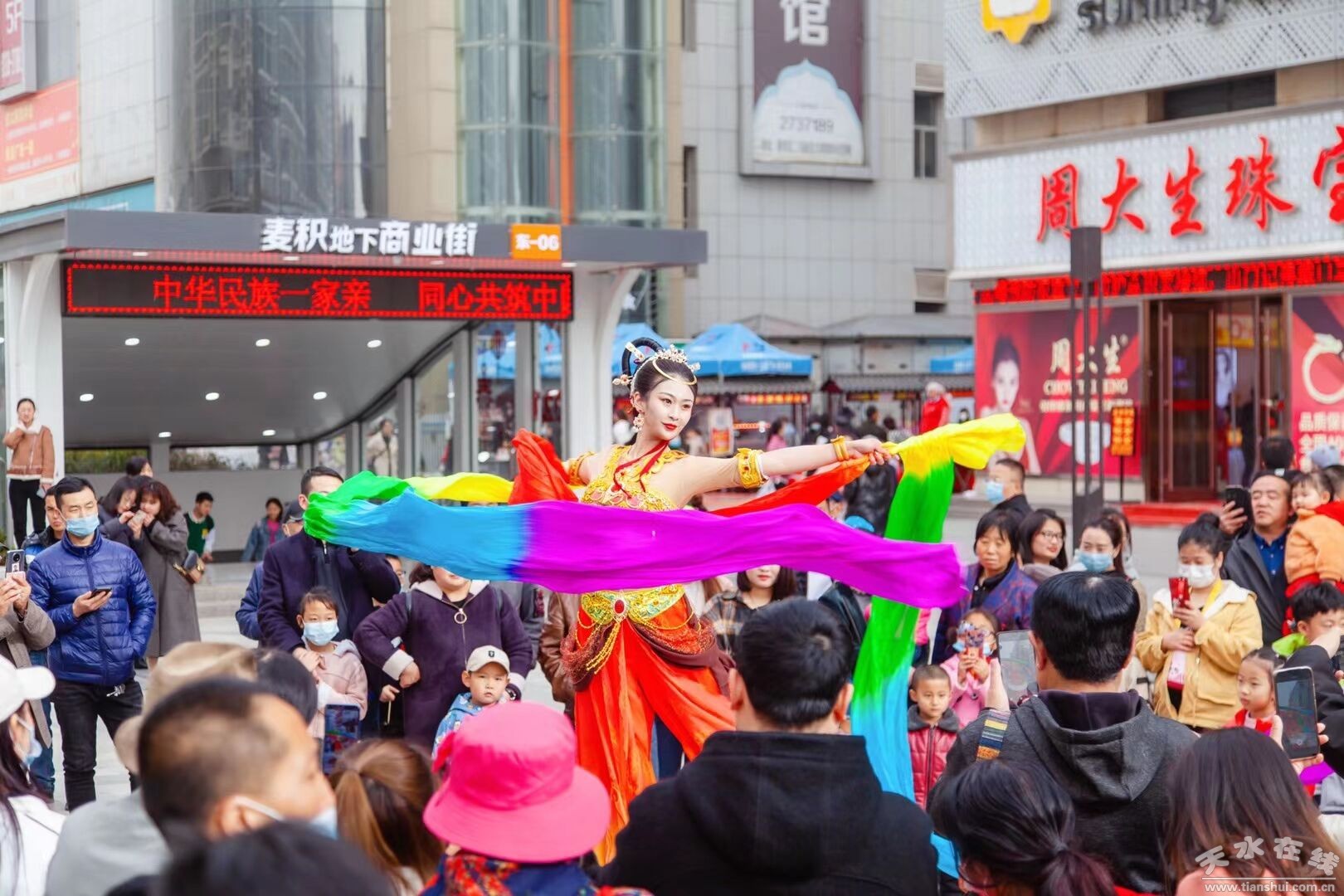 (“麥積飛天”在麥積區(qū)商埠路步行街表演)