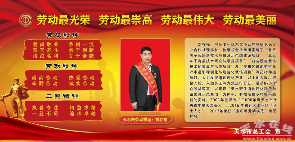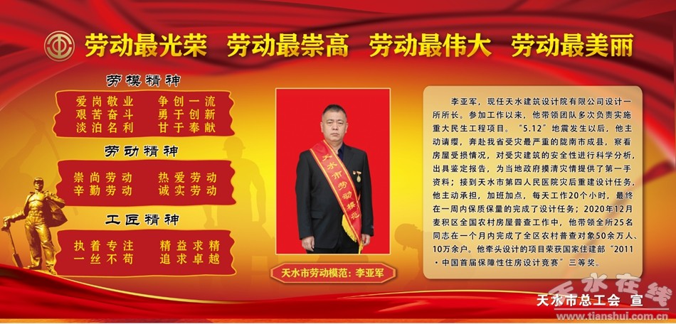 為牢固樹立尊重勞動(dòng)、尊重知識(shí)、尊重人才、尊重創(chuàng)造的鮮明導(dǎo)向,大力弘揚(yáng)“愛崗敬業(yè)、爭創(chuàng)一流,艱苦奮斗、勇于創(chuàng)新,淡泊名利、甘于奉獻(xiàn)”的勞模精神,鼓勵(lì)勞模先進(jìn)珍惜榮譽(yù)、保持本色,謙虛謹(jǐn)慎、戒驕戒躁,繼續(xù)發(fā)揮示范帶頭作用,繼續(xù)在平凡的崗位上創(chuàng)造不平凡的業(yè)績。我們將近幾年全市各行各業(yè)涌現(xiàn)出來的部分勞動(dòng)模范和先進(jìn)工作者做一展示,引導(dǎo)激勵(lì)廣大勞動(dòng)者學(xué)習(xí)先進(jìn)、爭當(dāng)先進(jìn),凝聚加快發(fā)展的強(qiáng)大合力,形成每個(gè)勞動(dòng)者兢兢業(yè)業(yè)、各行各業(yè)比學(xué)趕幫、不同領(lǐng)域競相超越的生動(dòng)局面。