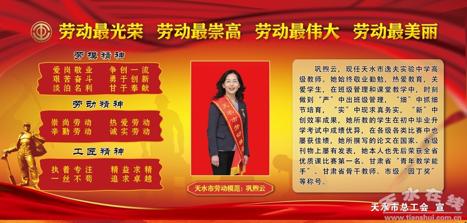 鞏煦云,現(xiàn)任天水市逸夫?qū)嶒?yàn)中學(xué)高級(jí)教師。她始終敬業(yè)勤勉,熱愛教育,關(guān)愛學(xué)生,在班級(jí)管理和課堂教學(xué)中,時(shí)刻做到“嚴(yán)”中出班級(jí)管理,“細(xì)”中抓細(xì)節(jié)培育,“實(shí)”中現(xiàn)求真務(wù)實(shí),“新”中創(chuàng)效率成果,她所教的學(xué)生在初中畢業(yè)升學(xué)考試中成績優(yōu)異,在各級(jí)各類比賽中也屢獲佳績,她所撰寫的論文在國家、省級(jí)刊物上屢有發(fā)表,她本人也先后榮獲全省優(yōu)質(zhì)課比賽第一名、甘肅省“青年教學(xué)能手”、甘肅省骨干教師、市級(jí)“園丁獎(jiǎng)”等稱號(hào)。