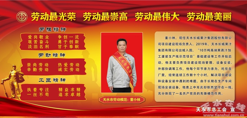 董小林,現(xiàn)任天水長城果汁集團(tuán)股份有限公司項(xiàng)目建設(shè)現(xiàn)場負(fù)責(zé)人。2019年,天水長城果汁集團(tuán)有限公司出城入園,“10萬噸高端果蔬汁加工灌裝生產(chǎn)線示范項(xiàng)目”基礎(chǔ)建設(shè)等工作開始啟動(dòng),他主要負(fù)責(zé)項(xiàng)目建設(shè)現(xiàn)場管理、設(shè)備安裝、外部協(xié)調(diào)等工作,他每個(gè)環(huán)節(jié)親力親為,吃住在廠里,經(jīng)常連續(xù)工作數(shù)十個(gè)小時(shí),解決項(xiàng)目建設(shè)和設(shè)備安裝中遇到的難題,由于長期在生產(chǎn)車間現(xiàn)場安裝設(shè)備,他患上中耳炎卻依然堅(jiān)守在一線,充分體現(xiàn)了一名共產(chǎn)黨員的先鋒模范作用。