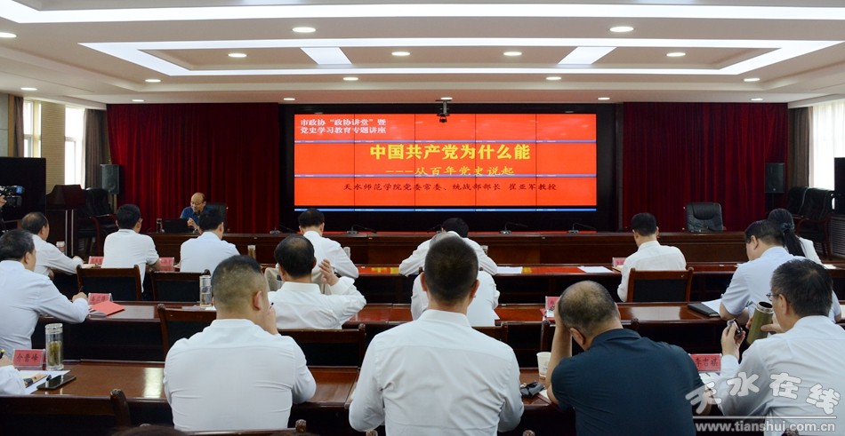 6月25日,天水市政協(xié)黨組書記、主席趙衛(wèi)東主持召開“政協(xié)講堂”暨市政協(xié)黨史學(xué)習(xí)教育專題輔導(dǎo)報(bào)告會,邀請市政協(xié)委員、天水師范學(xué)院黨委常委、統(tǒng)戰(zhàn)部長崔亞軍教授為市政協(xié)機(jī)關(guān)全體黨員作了題為《中國共產(chǎn)黨為什么能——從百年黨史說起》黨史教育專題輔導(dǎo)報(bào)告。