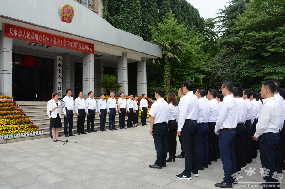7月2日下午,天水市人民政府辦公室(機(jī)關(guān))“全國(guó)文明單位”揭牌儀式舉行。王國(guó)先、趙四輩、張建杰、景丹、逯克宗、彭劍鳴、張棟梁、汪小娟、郭慶祥等市領(lǐng)導(dǎo)出席儀式。市政府秘書長(zhǎng)王永祥主持儀式。