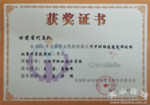 6月28日至30日,2021年全國(guó)職業(yè)院校技能大賽中職組建筑裝飾技能賽項(xiàng)在山東省煙臺(tái)市舉行。該校由指導(dǎo)教師陳冕、任偉和2名學(xué)生選手代表甘肅省參加此次比賽,和來(lái)自全國(guó)各地的30支代表隊(duì)同臺(tái)競(jìng)技,經(jīng)過(guò)緊張激烈的角逐榮獲二等獎(jiǎng)。