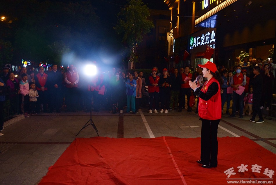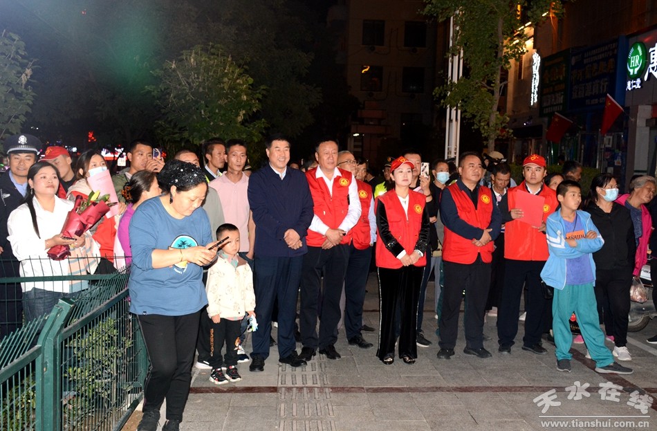 當(dāng)晚,演出在天水市西秦腔研究院的演員們表演宣傳“創(chuàng)城”活動(dòng)的快板“共創(chuàng)文明新龍城”中拉開(kāi)帷幕;隨后,市委政法委常務(wù)副書(shū)記陳璧田致辭,宣傳“創(chuàng)城”活動(dòng)的目的意義;天水在線主播萌萌表演了“麥積飛天”;市委政法委干部馬瑋宣讀了天水市委政法委致大眾南路沿街各單位、小區(qū)、商鋪的“文明城市創(chuàng)建倡議書(shū)”;最后,天水市西秦腔研究院院長(zhǎng)袁丫丫壓軸表演了秦腔清唱“紅燈記”選段。期間,市委政法委志愿者還向觀眾發(fā)放了天水市委政法委致大眾南路沿街各單位、小區(qū)、商鋪的“文明城市創(chuàng)建倡議書(shū)”。