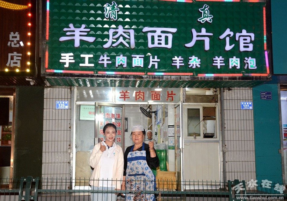 (羊肉面片館負(fù)責(zé)人與天水在線主播萌萌合影留念) |