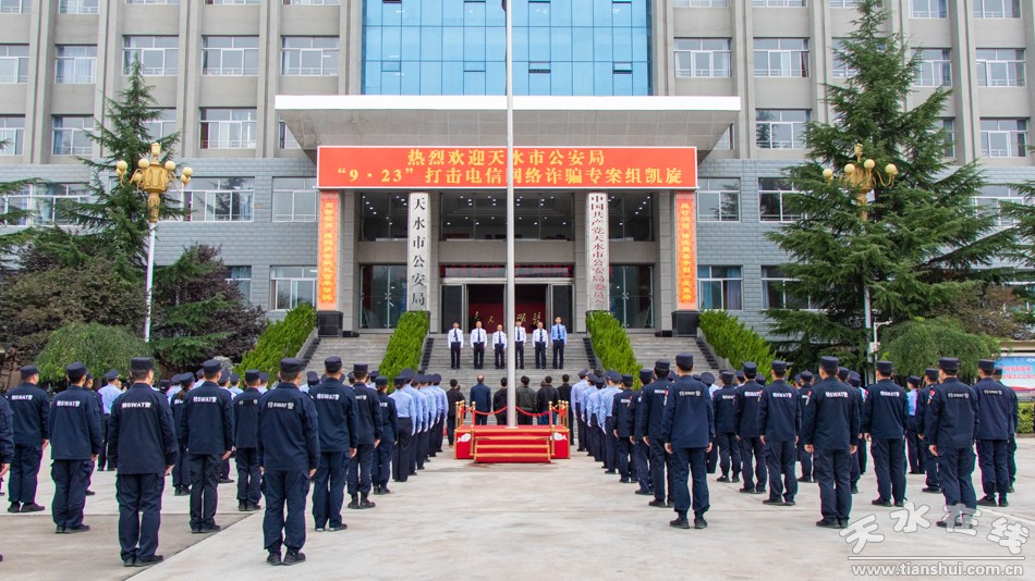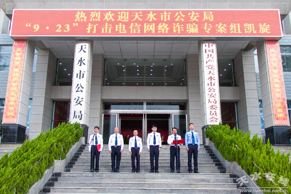 9月27日上午,天水市公安局隆重舉行“9·23”打擊電信網(wǎng)絡(luò)詐騙專案組凱旋歡迎儀式。公安部刑偵局二級(jí)巡視員鄭翔、省公安廳一級(jí)警務(wù)專員劉琪基出席歡迎儀式并對(duì)專案民警進(jìn)行慰問(wèn),副市長(zhǎng)、市公安局黨委書記、局長(zhǎng)郭慶祥致辭。