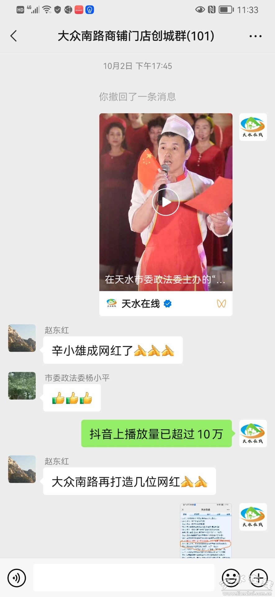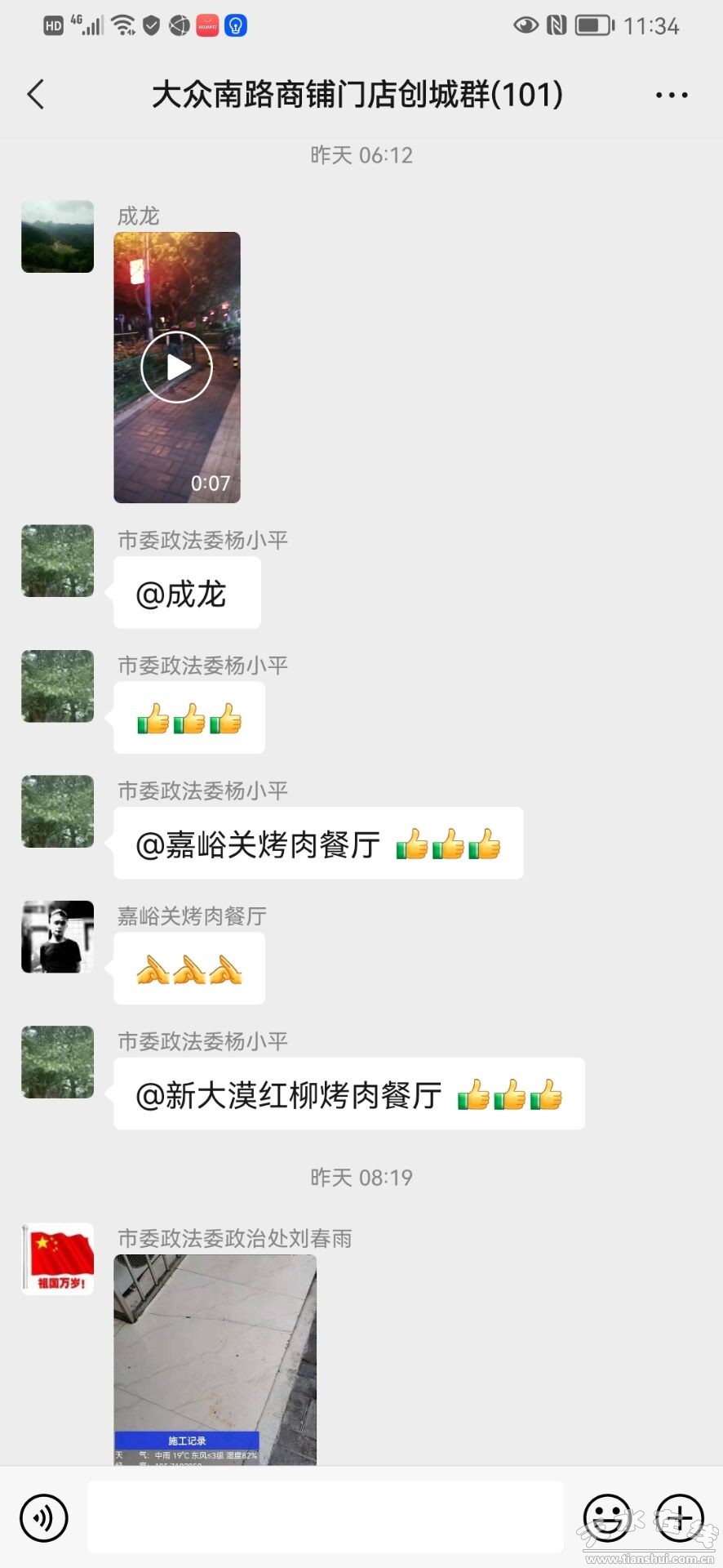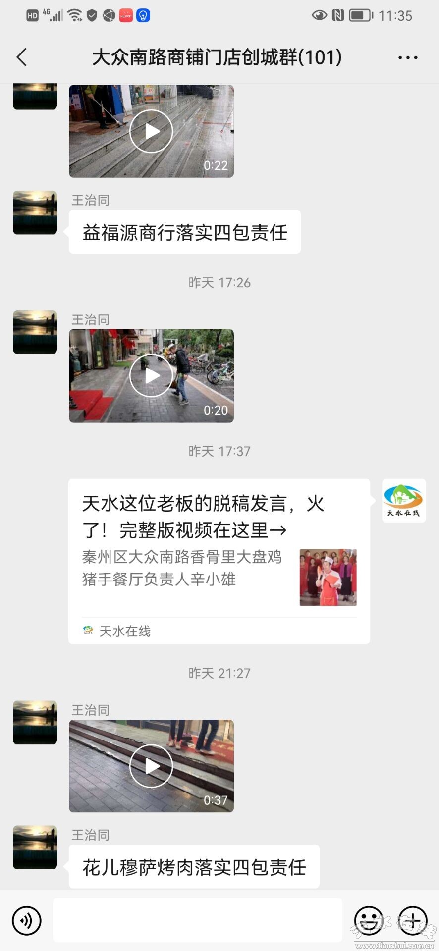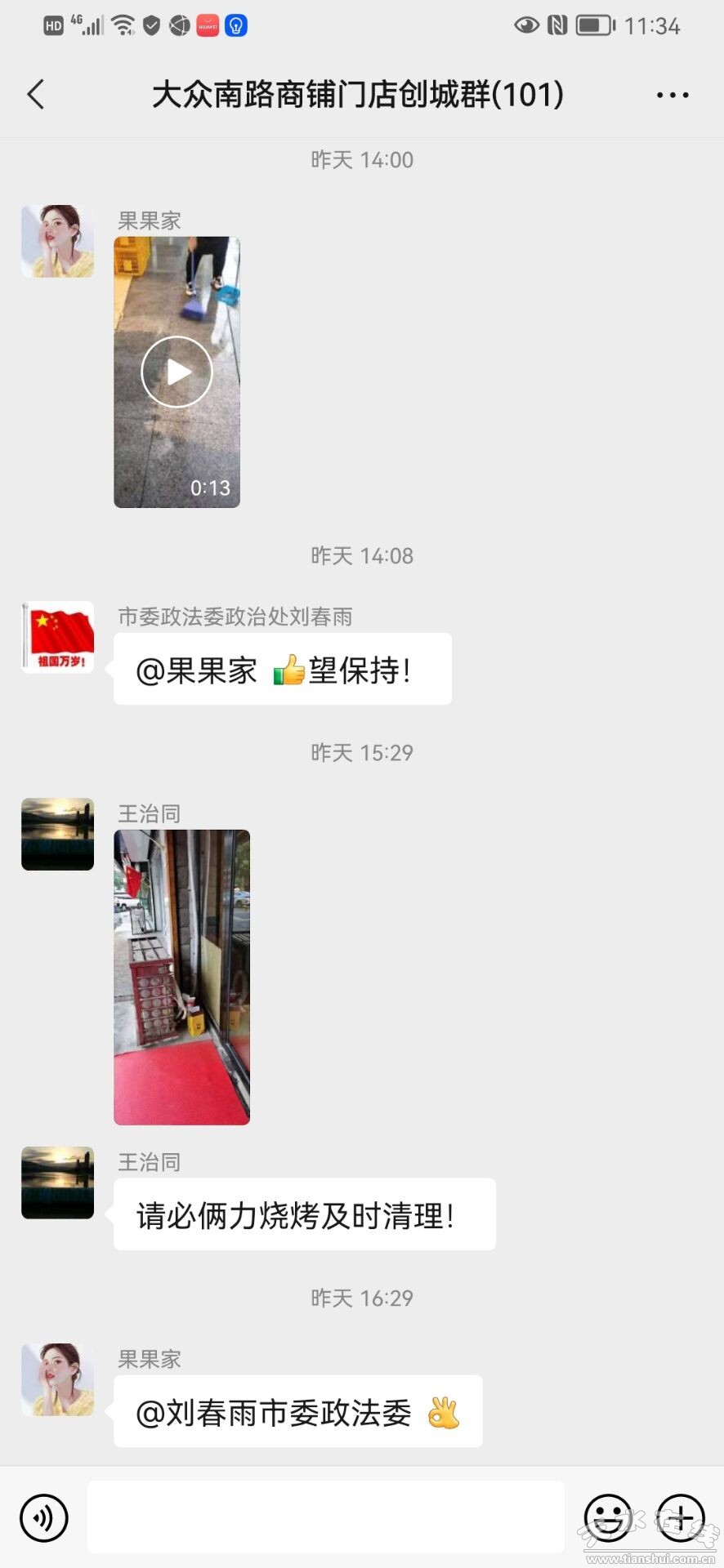 10月4日,天水在線在市委政法委創(chuàng)建的“包街”責(zé)任路段大眾南路創(chuàng)城群看到,連日來(lái),市委政法委志愿者國(guó)慶假日還在持續(xù)上街打掃衛(wèi)生,積極勸導(dǎo)亂丟煙頭、橫穿馬路、騎車不戴頭盔等不文明行為,督導(dǎo)商戶認(rèn)真履行門前“四包”責(zé)任。同時(shí),這里的商戶也是踐行諾言,晚上19點(diǎn)、21點(diǎn),凌晨3點(diǎn)、5點(diǎn),還在清潔門前衛(wèi)生,堅(jiān)決支持“創(chuàng)城”,嚴(yán)格落實(shí)門前“四包”責(zé)任。請(qǐng)看聊天記錄: