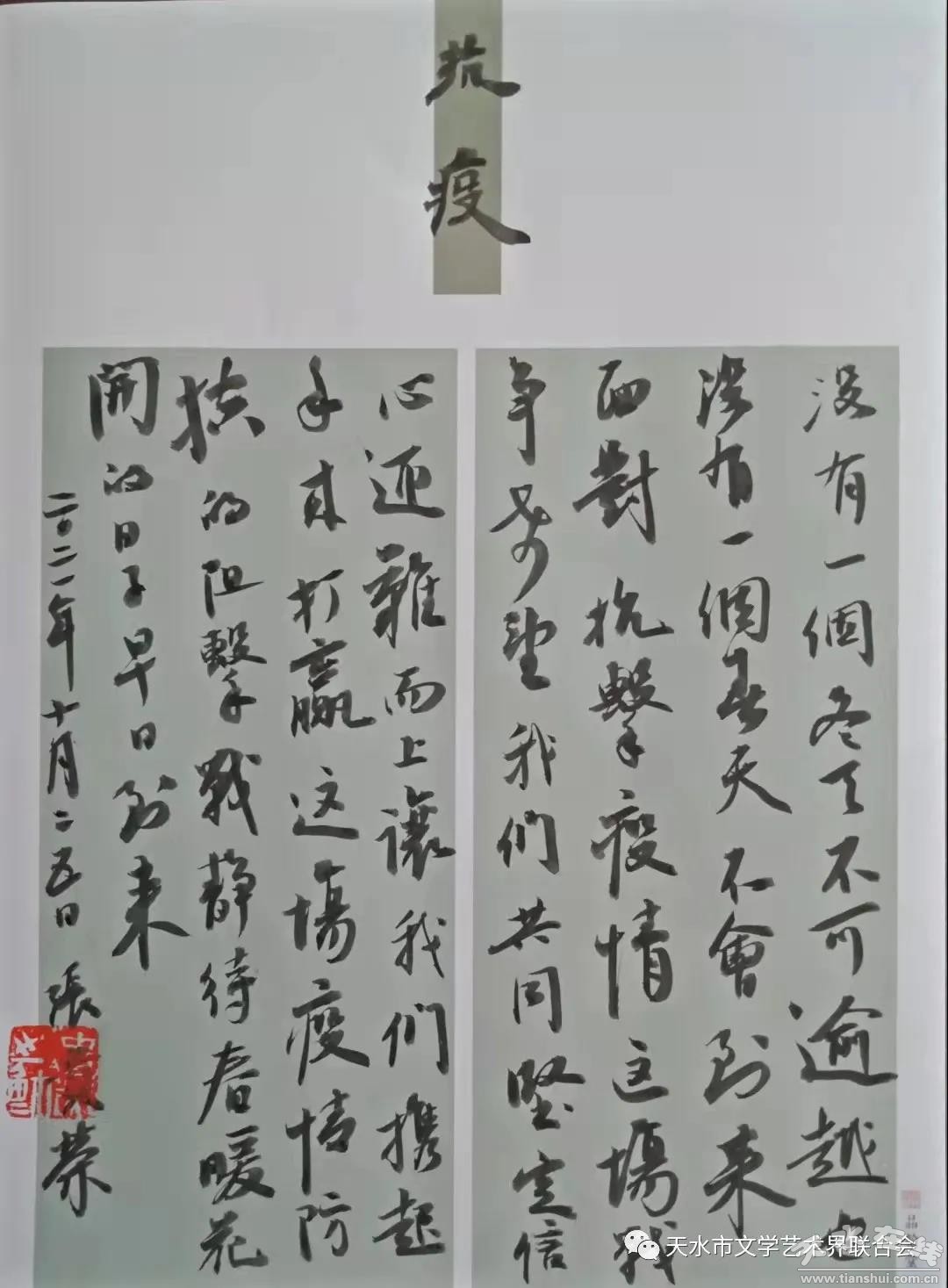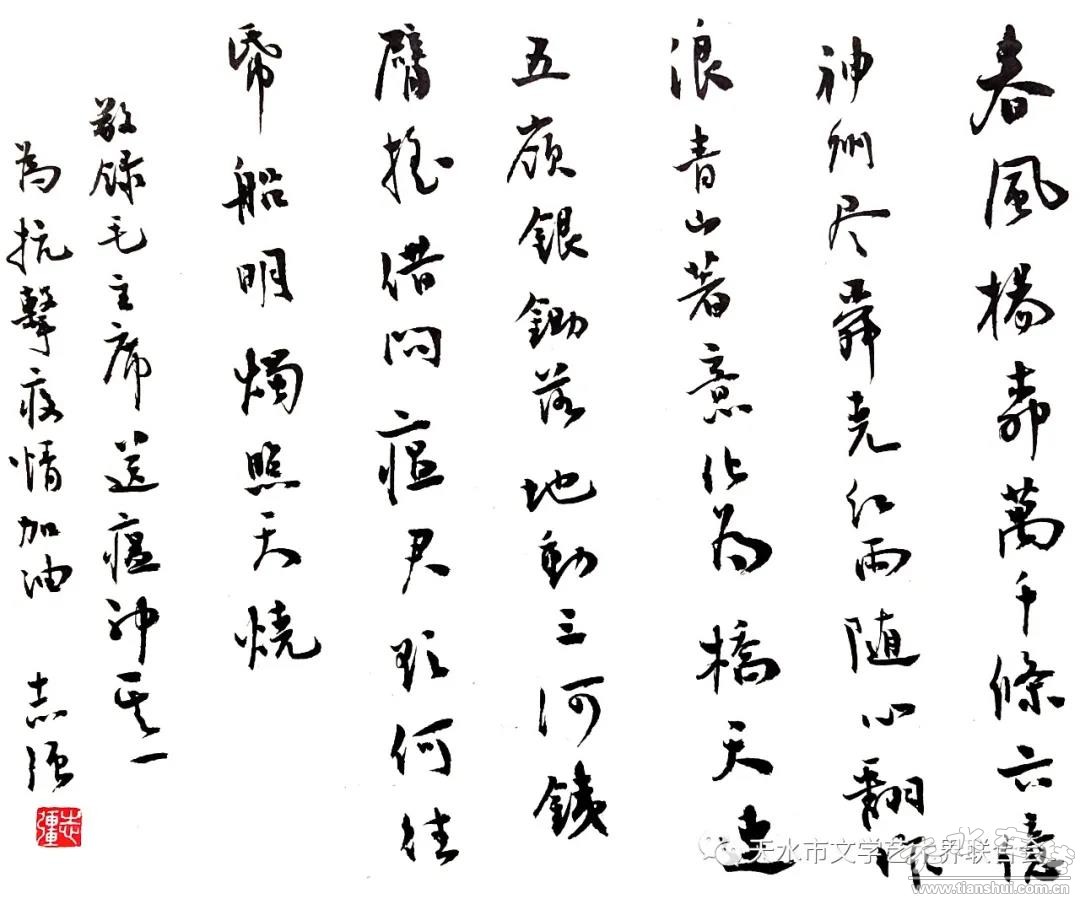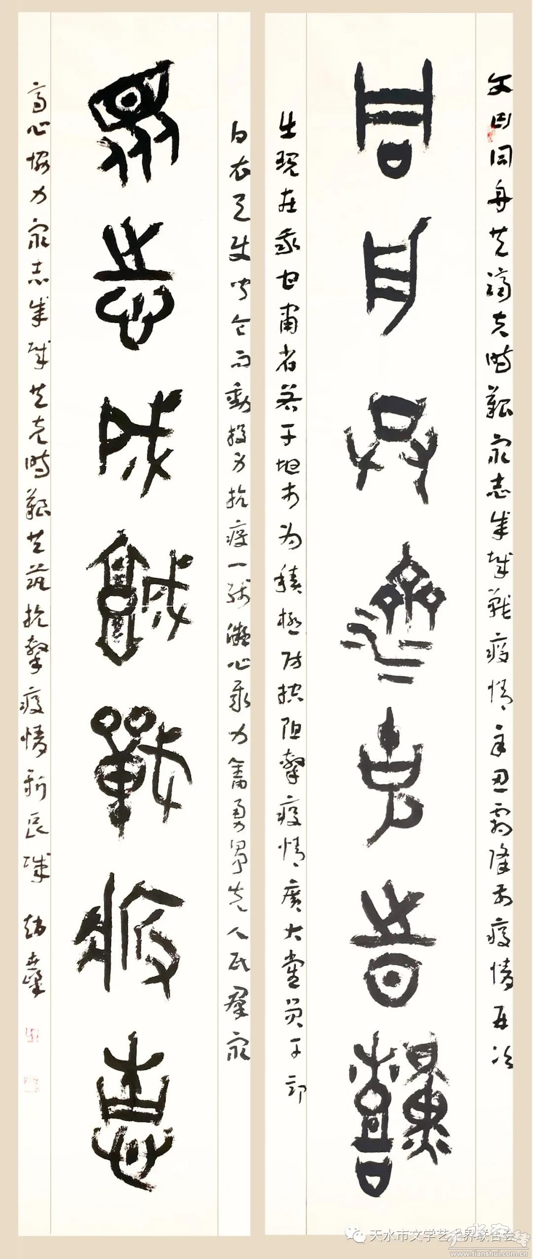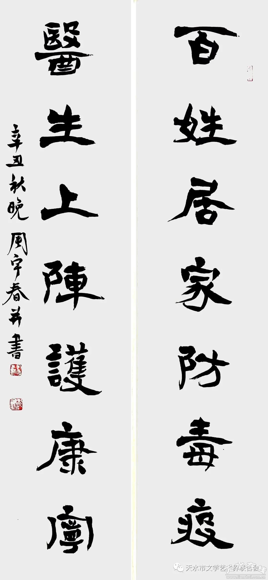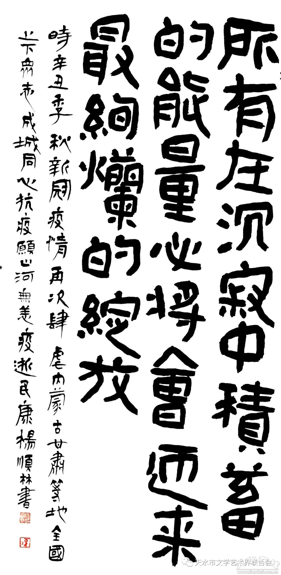 近日,甘肅省多地疫情防控應急響應啟動,做好當前疫情防控工作刻不容緩。為認真貫徹落實習近平總書記關于疫情防控工作的重要指示和省、市疫情防控各項安排部署,天水市廣大文藝工作者迅速行動,在這場沒有硝煙的戰(zhàn)場上,以藝抗疫,用愛發(fā)聲,非常時期盡非常之責,廣大文藝工作者肩負起應盡的使命和責任,為正義而歌、為英雄喝彩,以文學、美術、書法、音樂、舞蹈、攝影、戲曲、短視頻、剪紙、泥塑、刺繡、雕刻等藝術形式,創(chuàng)作反映人民群眾萬眾一心、抗擊新冠肺炎疫情的優(yōu)秀作品,鼓舞士氣,振奮精神,傳播正能量,謳歌真英雄,齊心協(xié)力共筑抗擊疫情新長城,為打贏全市疫情防控攻堅戰(zhàn)貢獻文藝力量。