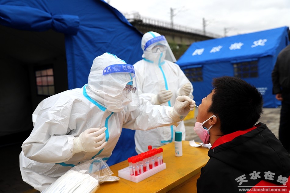 當(dāng)天,天水市秦州區(qū)、麥積區(qū)第八輪大規(guī)模核酸檢測啟動(dòng),3000名醫(yī)護(hù)工作者分布在425個(gè)采樣點(diǎn)、902個(gè)采樣臺上,以平均每個(gè)采樣臺每分鐘完成1人的速度推進(jìn)區(qū)采樣工作。
