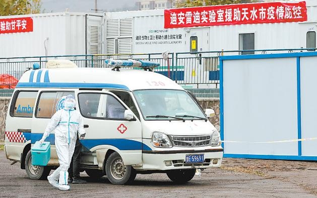 上午10時(shí),120救護(hù)車載著當(dāng)天第一批次樣本來到位于麥積區(qū)城南體育場的方艙實(shí)驗(yàn)室。兩區(qū)采集到的樣本被114臺轉(zhuǎn)運(yùn)車輛分別運(yùn)送到天水市第一人民醫(yī)院等8家醫(yī)療機(jī)構(gòu)和雷迪方艙實(shí)驗(yàn)室等4家第三方實(shí)驗(yàn)室進(jìn)行檢驗(yàn)。