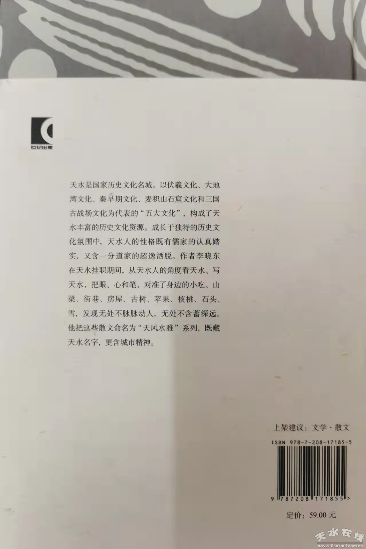 日前,曾經(jīng)在天水市掛職擔任市委常委、副市長的李曉東散文集《天風水雅》由上海人民出版社精裝出版發(fā)行。李曉東在天水市掛職前系《小說選刊》副主編,現(xiàn)任中國作家協(xié)會社會聯(lián)絡(luò)部副主任(主持工作)!短祜L水雅》集中反映了作者對天水歷史、地理、人文、風物的深度觀察、感悟、判斷與思考。