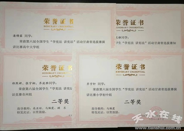 在剛剛結(jié)束的第六屆全國學(xué)生“學(xué)憲法 講憲法”活動甘肅省選拔賽中,市逸夫?qū)嶒炛袑W(xué)齊宇軒同學(xué)獲得演講比賽二等獎、市實驗小學(xué)張格悅同學(xué)獲得演講比賽三等獎、天水市教育局獲得知識競賽團體二等獎的好成績。