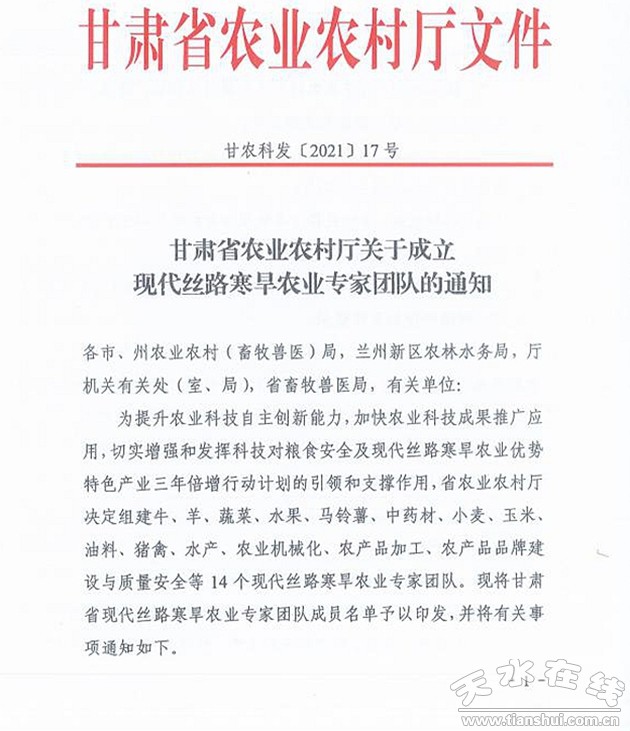 根據(jù)甘肅省農(nóng)業(yè)農(nóng)村廳關(guān)于成立現(xiàn)代絲路寒旱農(nóng)業(yè)專家團(tuán)隊(duì)的通知精神(甘農(nóng)科發(fā)【2021】17號(hào)),為提升農(nóng)業(yè)科技自主創(chuàng)新能力,加快農(nóng)業(yè)科技成果推廣應(yīng)用,切實(shí)增強(qiáng)和發(fā)揮科技對(duì)糧食安全及現(xiàn)代絲路寒旱農(nóng)業(yè)優(yōu)勢(shì)特色產(chǎn)業(yè)的三年倍增行動(dòng)計(jì)劃引領(lǐng)和支撐作用,省農(nóng)業(yè)農(nóng)村廳決定組建牛、羊、蔬菜、水果、馬鈴薯、中藥材、小麥、玉米、油料、豬禽、水產(chǎn)、農(nóng)業(yè)機(jī)械化、農(nóng)產(chǎn)品加工、農(nóng)產(chǎn)品品牌建設(shè)與質(zhì)量安全等14個(gè)現(xiàn)代絲路寒旱農(nóng)業(yè)專家團(tuán)隊(duì)。專家團(tuán)隊(duì)的主要職責(zé)是為全省現(xiàn)代絲路寒旱農(nóng)業(yè)優(yōu)勢(shì)特色產(chǎn)業(yè)提供決策咨詢、技術(shù)培訓(xùn)、技術(shù)指導(dǎo)、科研攻關(guān)等工作。