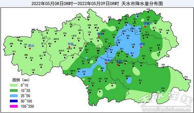 【摘要】受冷空氣和高原暖濕氣流共同影響,8日上午開始,我市出現(xiàn)大范圍降水天氣。截止9日08時,全市普降小到中雨,部分鄉(xiāng)鎮(zhèn)大到暴雨,共有4個站次出現(xiàn)短時強降水,最大雨強24.5毫米/小時;最大累積降水量為50.3毫米,出現(xiàn)在清水縣郭川鎮(zhèn)。