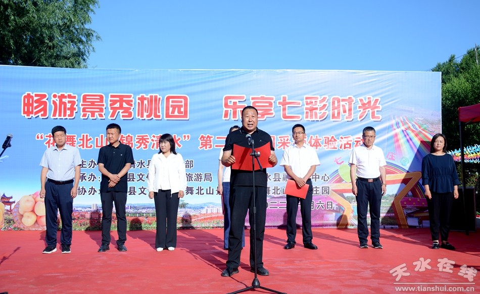 “水碧山青新果好,香甜肉脆眾人褒!毖巯,正是清水縣花舞北山景秀園黃桃成熟的季節(jié),為展示清水縣全力打造南北兩山,積極構(gòu)建全域旅游新格局的喜人成果,反映文旅農(nóng)康融合新業(yè)態(tài)、新布局,推介“親水賞花治未病 樂我養(yǎng)我育新我”旅游品牌和“軒轅故里•康養(yǎng)福地”公共地域品牌,清水縣7月6日上午在花舞北山景秀園舉行了“花舞北山 錦秀清水”第二屆游園采摘體驗(yàn)活動(dòng)啟動(dòng)儀式。