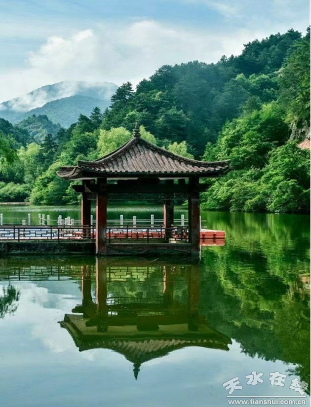 北方的雄山旁伴著南方的秀水淙淙,景色相比相稱。潭湖相連,呈飛魚狀,鑲嵌在群峰之間,東北方一峰突兀而起,酷似麥積山,當(dāng)?shù)厝硕挤Q之為小麥積山。溫潤如翡翠般的湖水在霧氣中若隱若現(xiàn),仿佛真的有仙人住在這里。