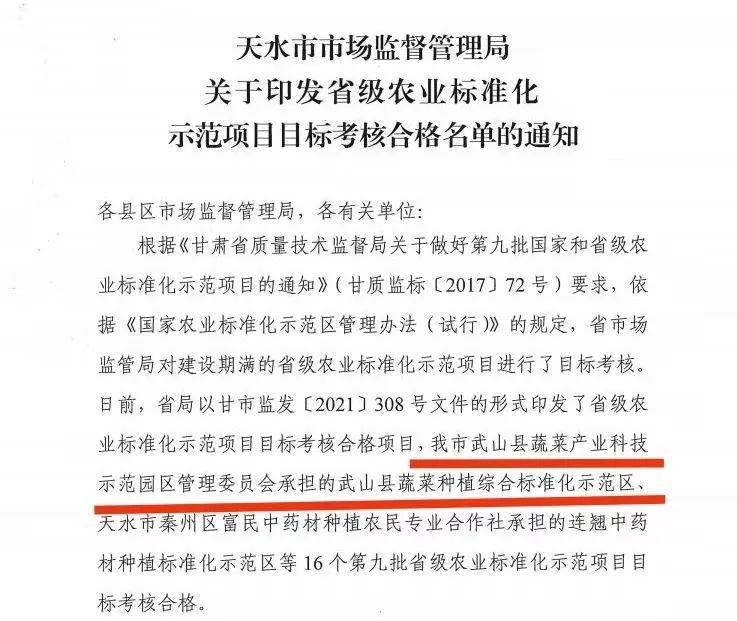 武山縣蔬菜種植綜合標(biāo)準(zhǔn)化示范區(qū)是第九批省級蔬菜種植綜合標(biāo)準(zhǔn)化示范項目,項目實施以來,市、縣市場監(jiān)管部門圍繞試點確定的重點方向,以促進(jìn)示范試點單位優(yōu)化結(jié)構(gòu)、提升質(zhì)量、打造品牌、促進(jìn)發(fā)展為出發(fā)點,精心培育,精細(xì)指導(dǎo),精準(zhǔn)幫扶,在標(biāo)準(zhǔn)體系構(gòu)建、標(biāo)準(zhǔn)制修訂、采標(biāo)對標(biāo)達(dá)標(biāo)等方面跟進(jìn)服務(wù)指導(dǎo)。通過標(biāo)準(zhǔn)化生產(chǎn)和管理,推動辣椒、架豆、甘薯種植以及散養(yǎng)雞養(yǎng)殖成為當(dāng)?shù)孛撠氈赂坏闹鲗?dǎo)產(chǎn)業(yè),以產(chǎn)業(yè)發(fā)展帶動了農(nóng)民增收致富。
