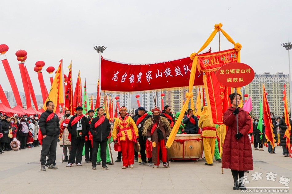 展演現(xiàn)場鑼鼓喧天,熱鬧非凡,人頭攢動,旋鼓聲響徹渭川上空。來自灘歌鎮(zhèn)代磨、城關鎮(zhèn)坪塬、洛門鎮(zhèn)礤石川、龍臺鎮(zhèn)賈山等6個村的旋鼓隊用鏗鏘雄渾的旋鼓舞展演,生動展示了“武山十有”文化的獨特魅力,充分展現(xiàn)了武山縣國家級非遺項目的風采與成果,吸引了不少市民駐足觀看,讓現(xiàn)場觀眾享受了一場精彩紛呈的文化盛宴,濃郁的年味兒在武山大地四處洋溢。