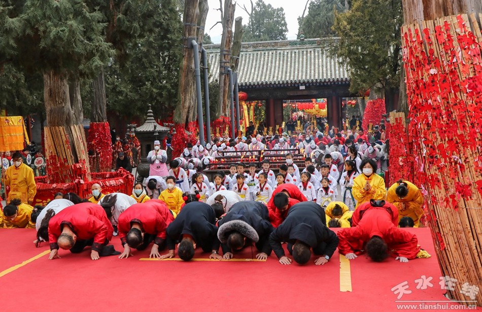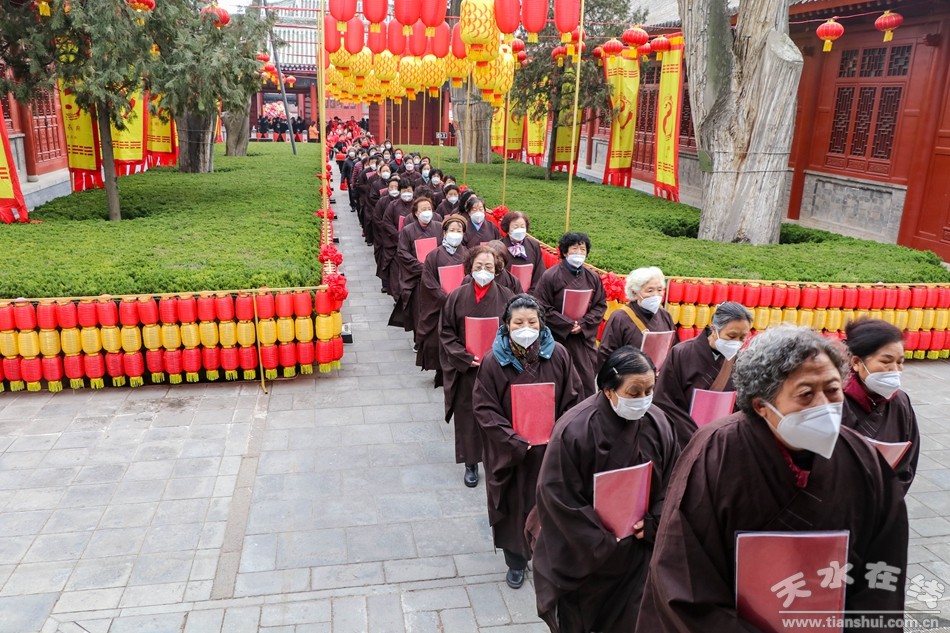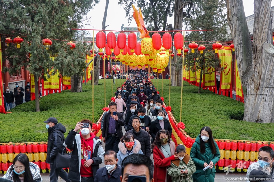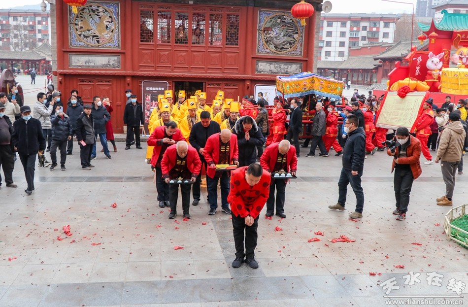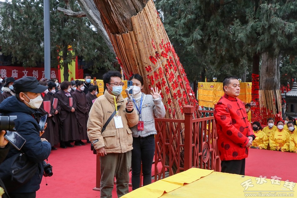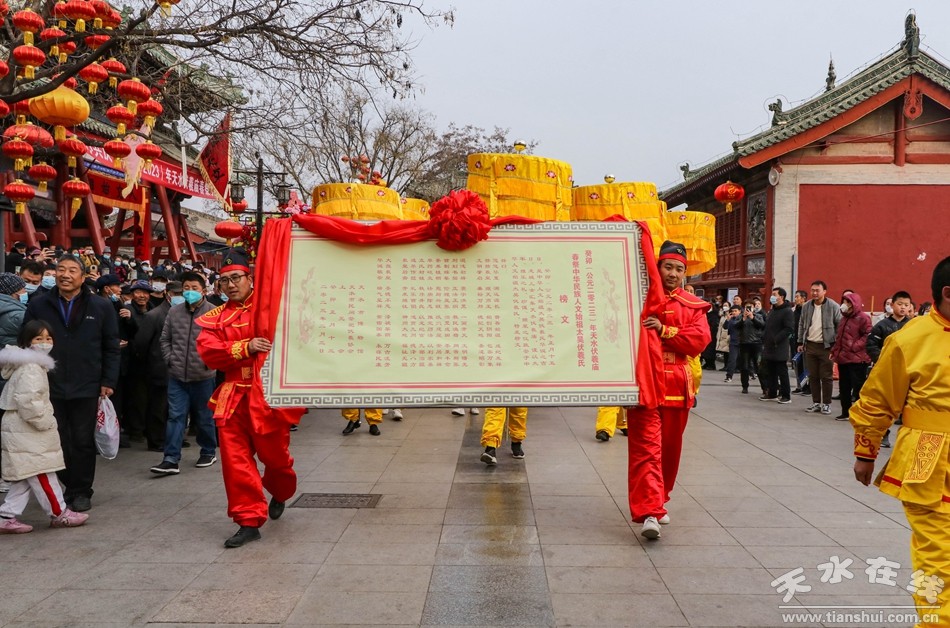 2月7日(正月十七)下午,同心共慶—癸卯(2023)年天水伏羲廟春祭文化廟會活動之送神儀式在伏羲廟前舉行。下午3時,方神黑爺塑像在浩浩蕩蕩的儀仗隊伍和上萬群眾的簇擁下進入伏羲廟,落座于先天殿月臺西側(cè)。主祭人舉行明燭、焚香、化表等儀式,方神黑爺拜過伏羲之后,在儀仗隊伍和群眾的擁簇下出伏羲廟,隨抬榜文的隊伍繞伏羲城一周至西牌坊前落座。主祭人在伏羲廣場面對黑爺塑像明燭、焚香、化表、獻茶后,將榜文焚燒,宣告送神儀式告成,也標(biāo)志著為期五天的同心共慶—癸卯(2023)年天水伏羲廟春祭文化廟會活動圓滿落幕。天水在線兩位主播通過天水在線抖音號進行了全程現(xiàn)場直播。
